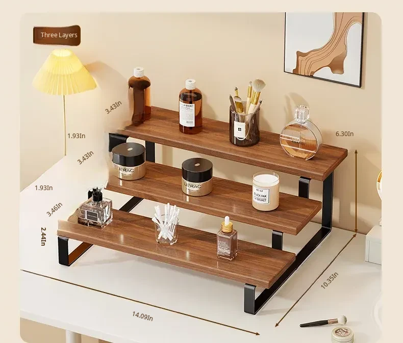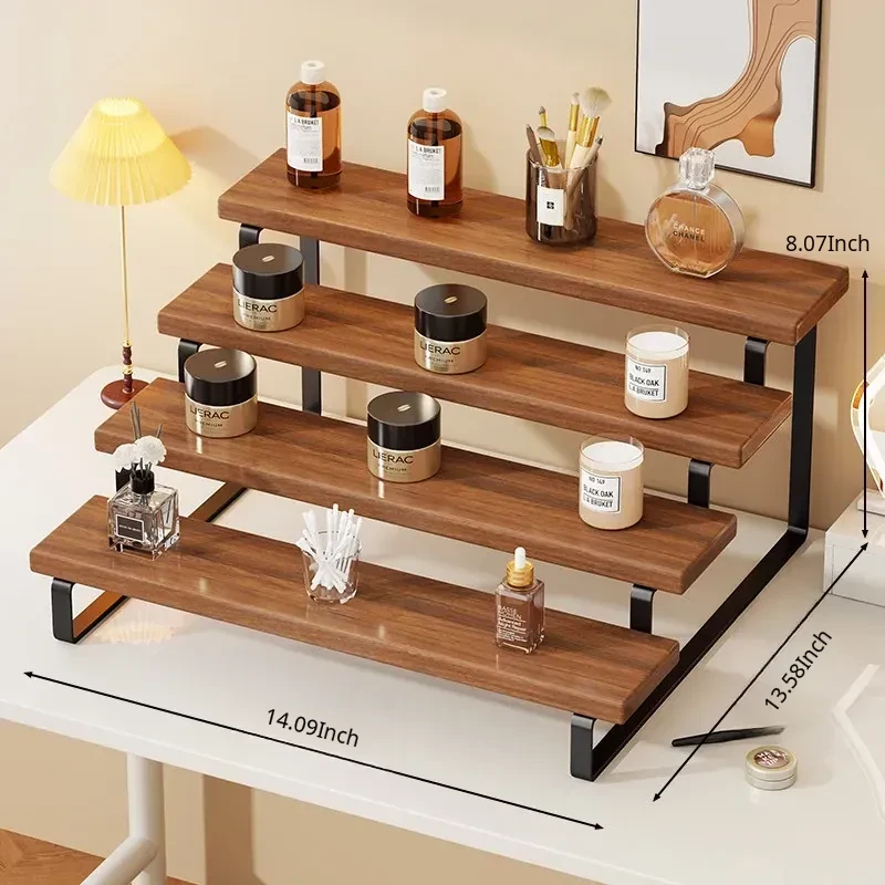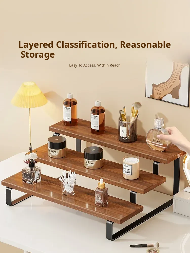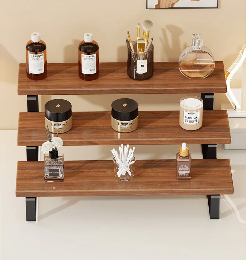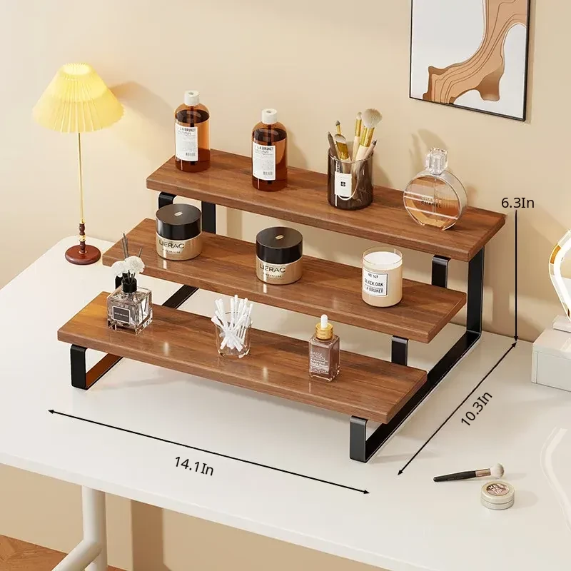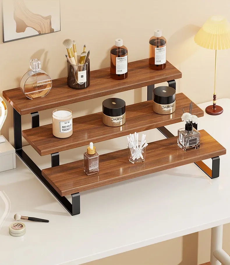 Stylish Desktop Organizer - Multi-Tiered Storage Rack for Home Vanity, Perfect for Displaying Perfumes and Cosmetics, Made of Durable Iron and Wood for Skincare Products.