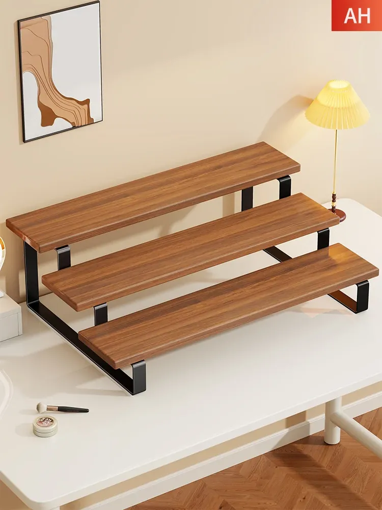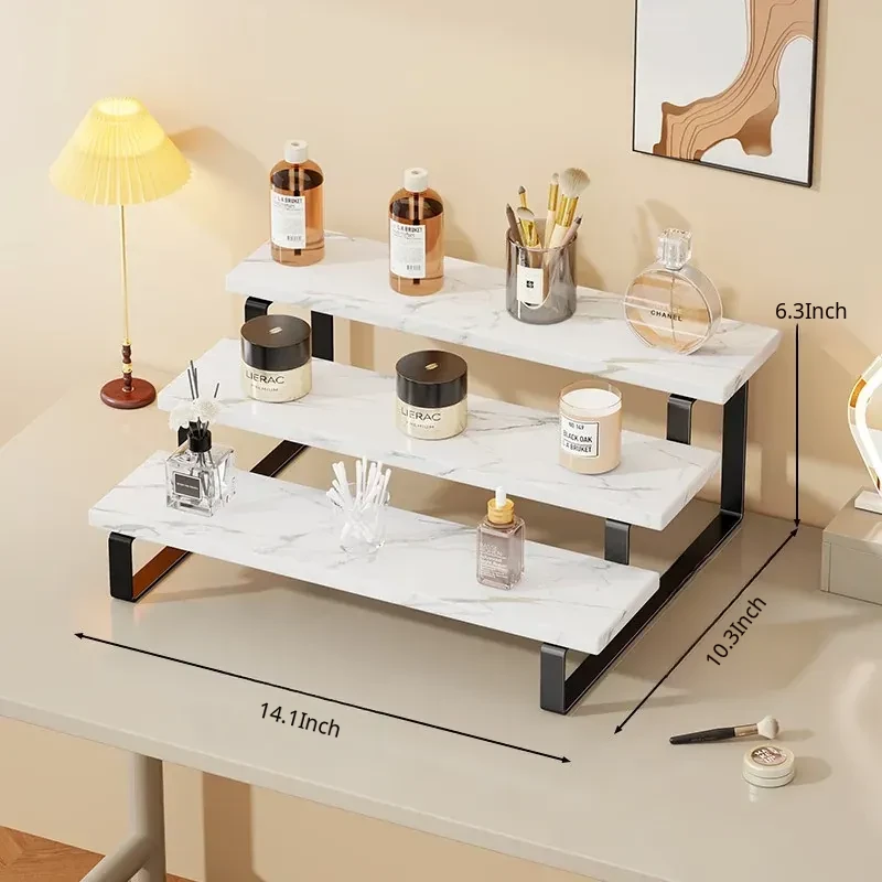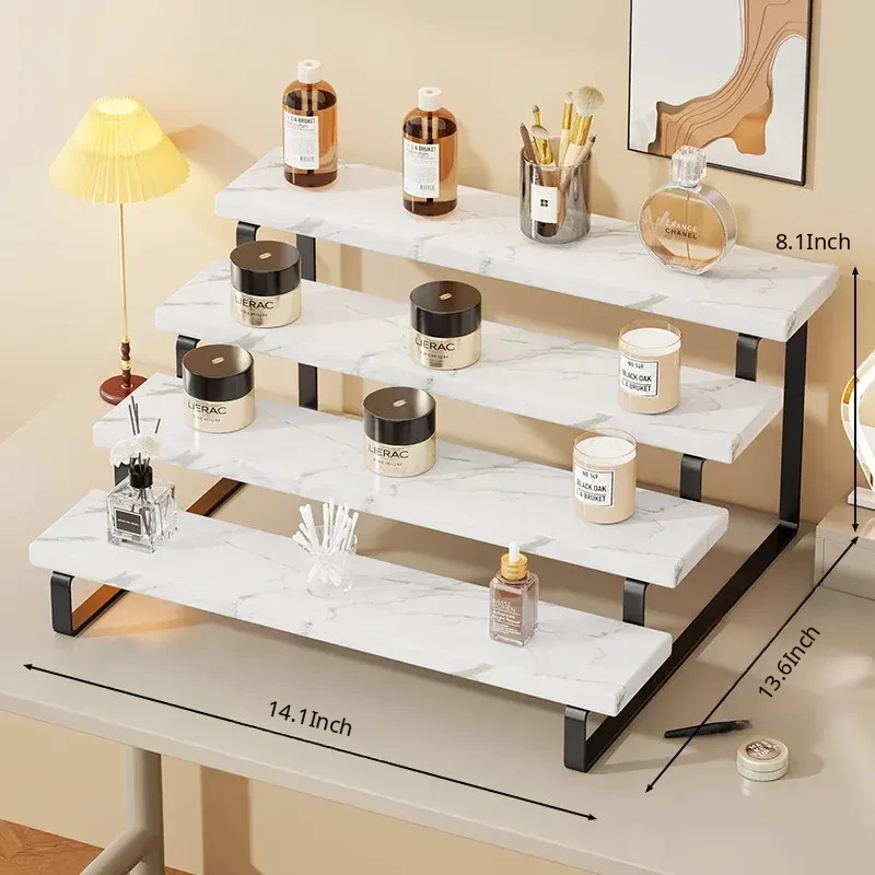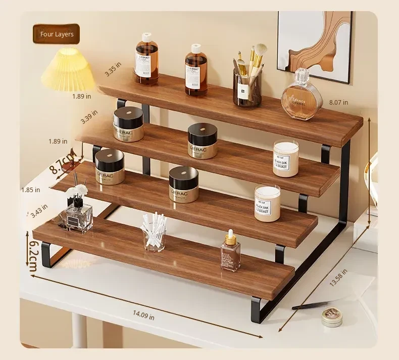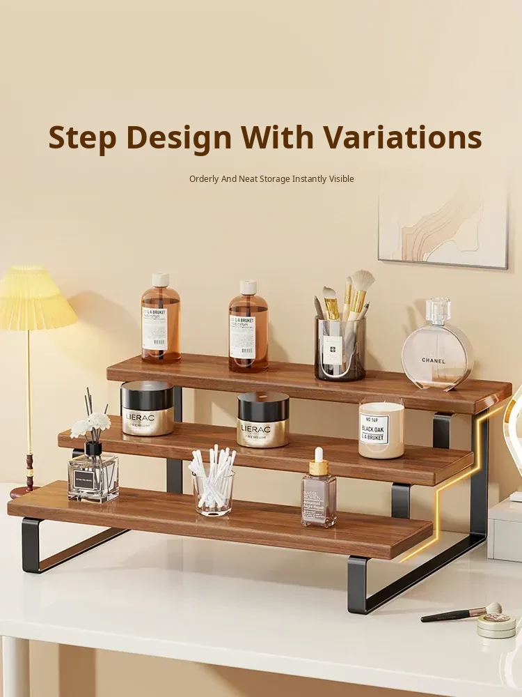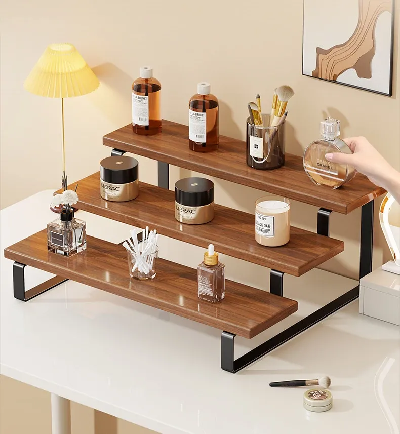 Stylish Desktop Organizer - Multi-Tiered Storage Rack for Home Vanity, Perfect for Displaying Perfumes and Cosmetics, Made of Durable Iron and Wood for Skincare Products.