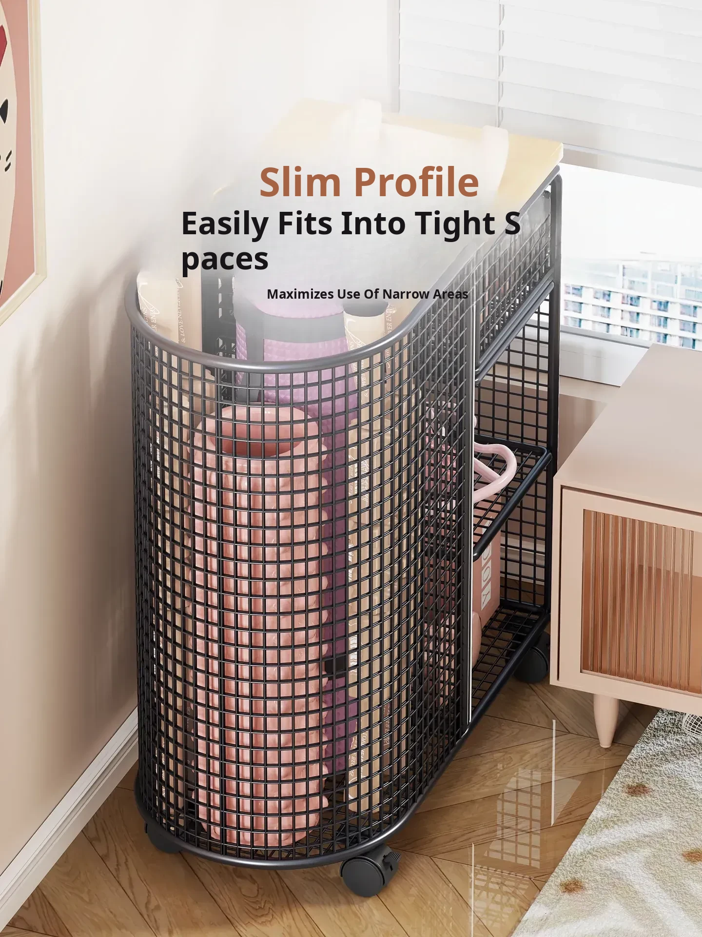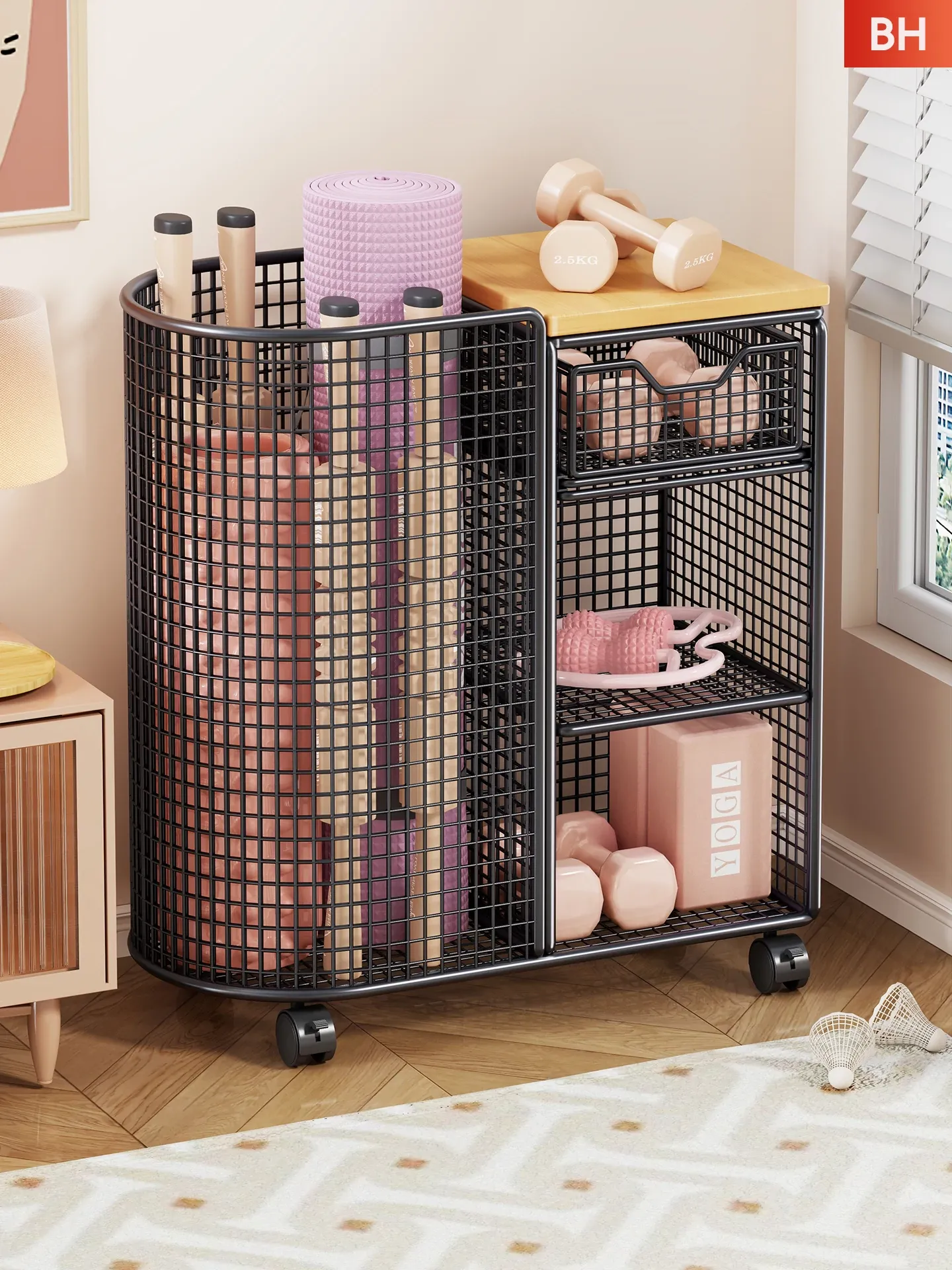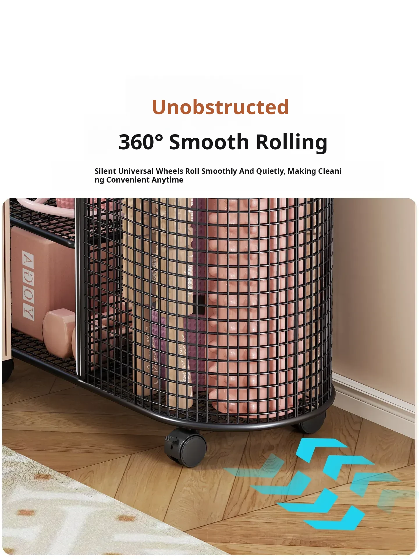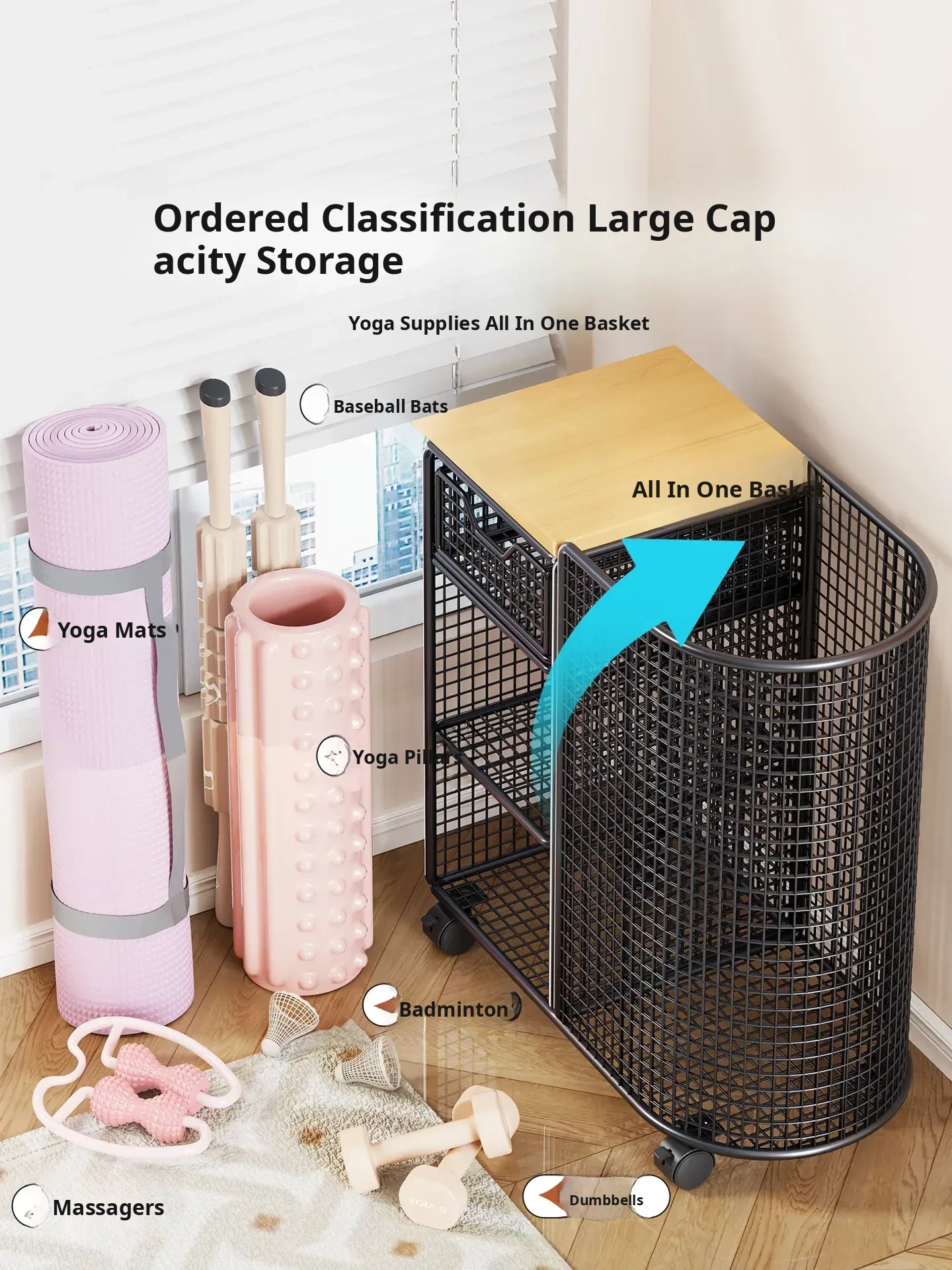 Yoga Mat Storage Basket with Wheels - Portable Organizer for Home, Ideal for Basketball and Fitness Equipment. Perfect Solution for Keeping Your Workout Space Tidy!