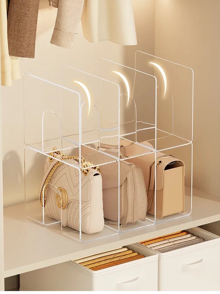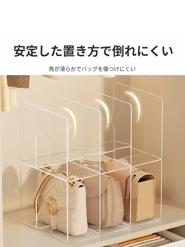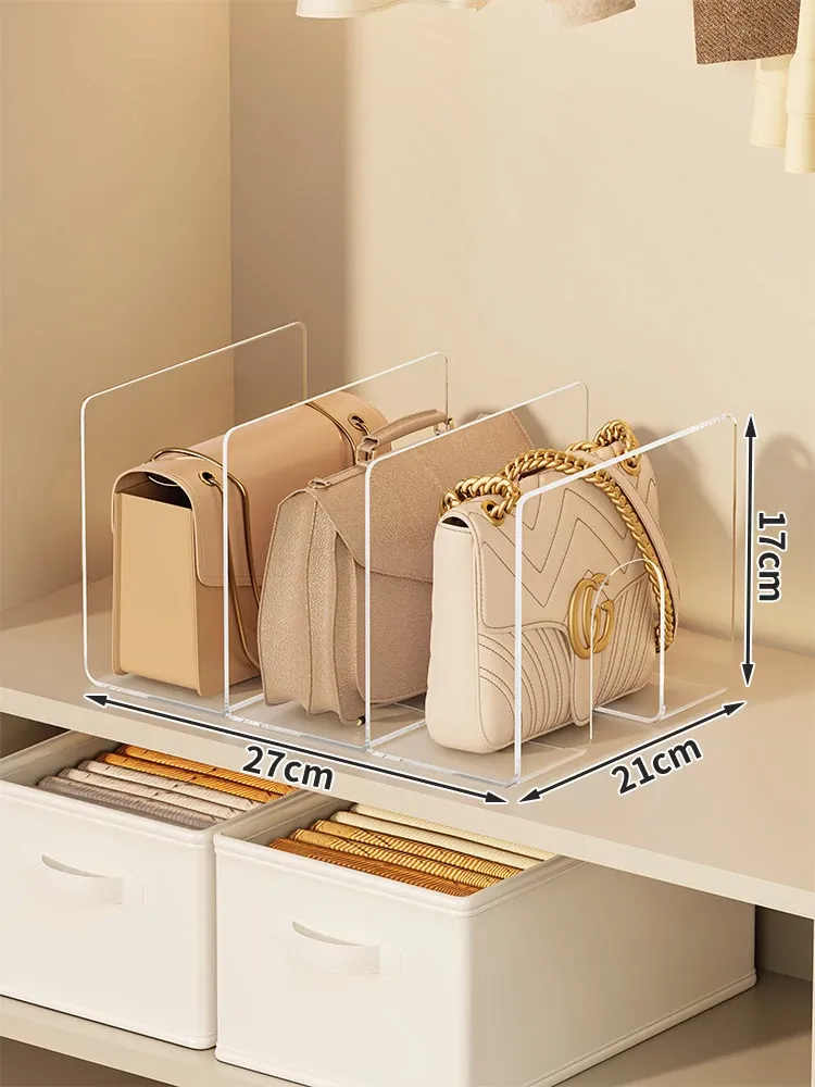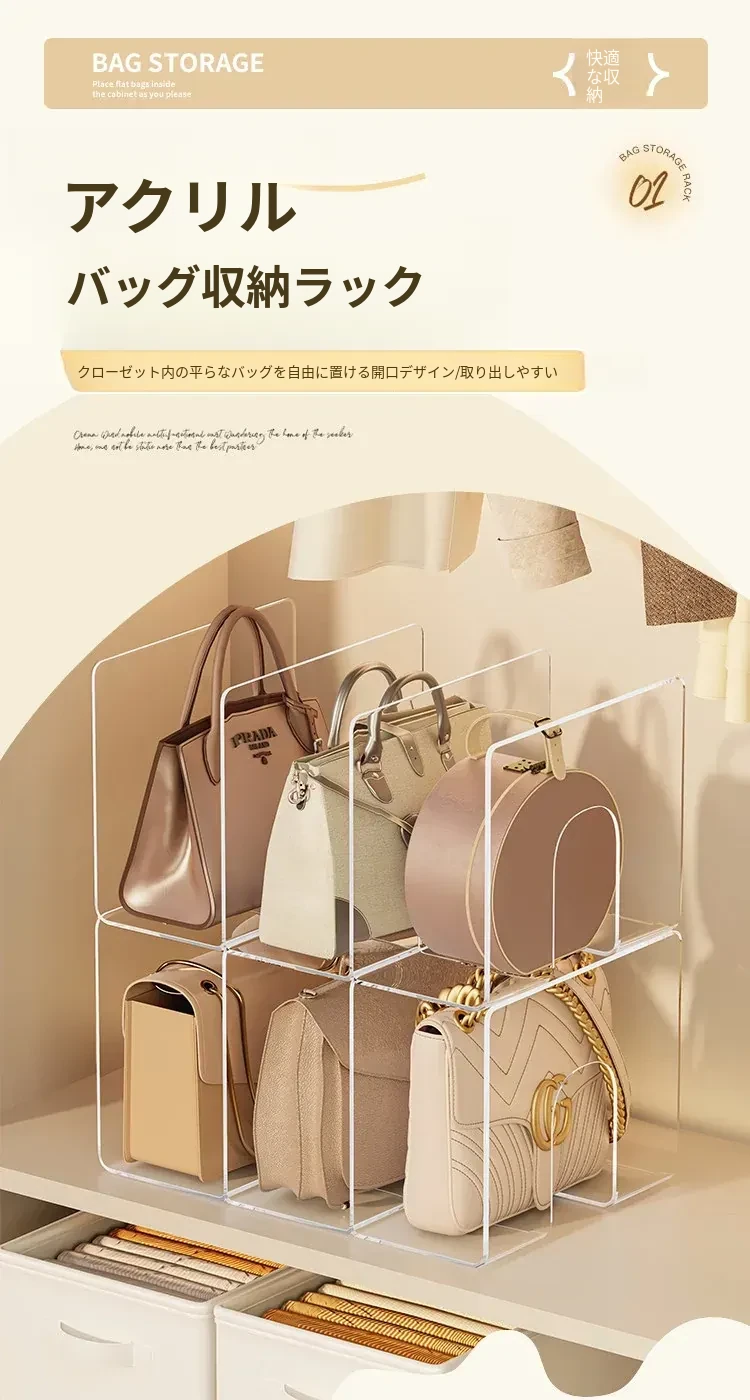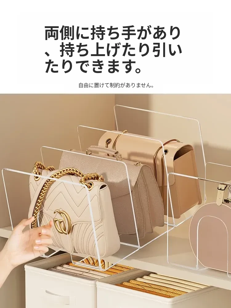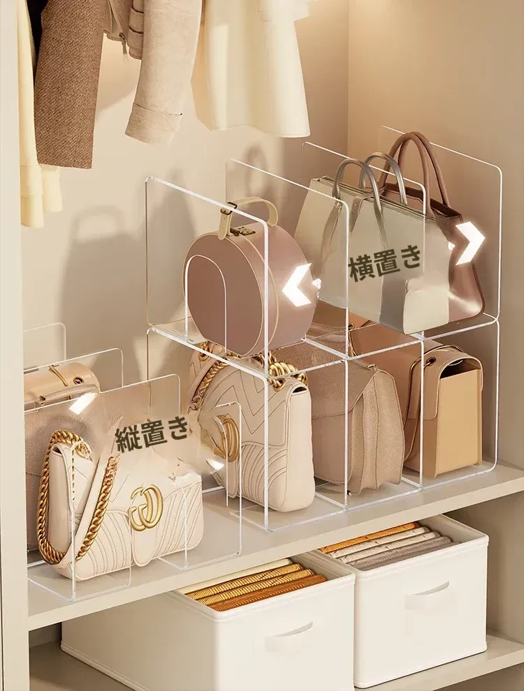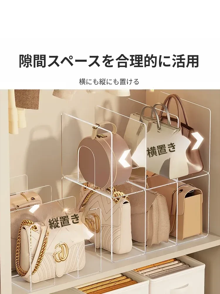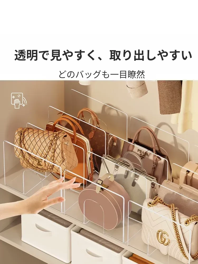バッグ収納の新アイデア!アクリル仕切り板でクローゼットをスッキリ整理。透明なディスプレイラックとハンギングバッグホルダーで、あなたの大切なバッグを美しく見せる!