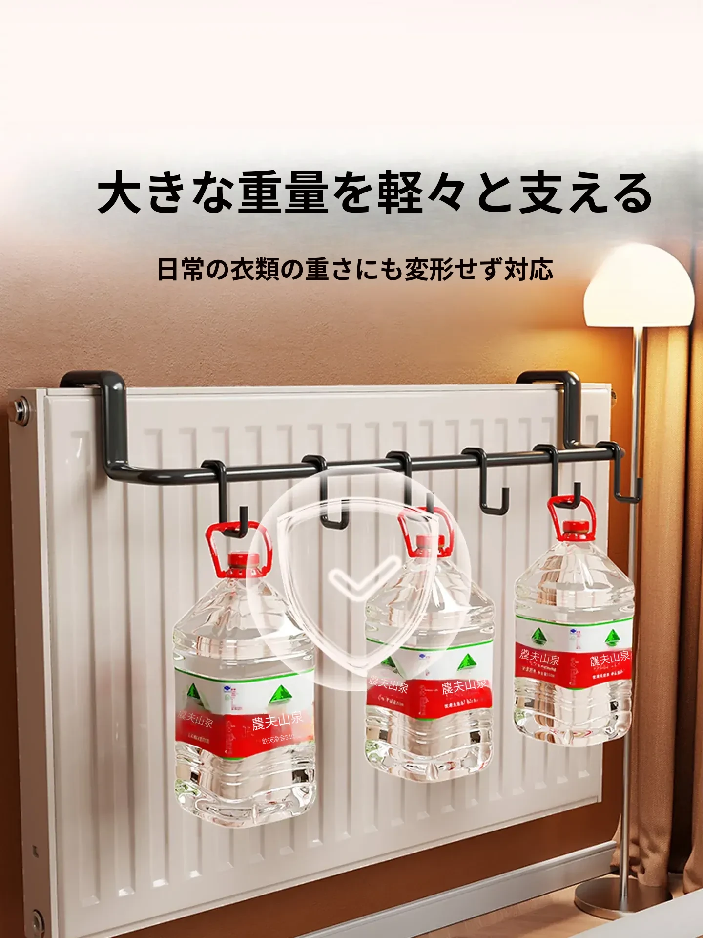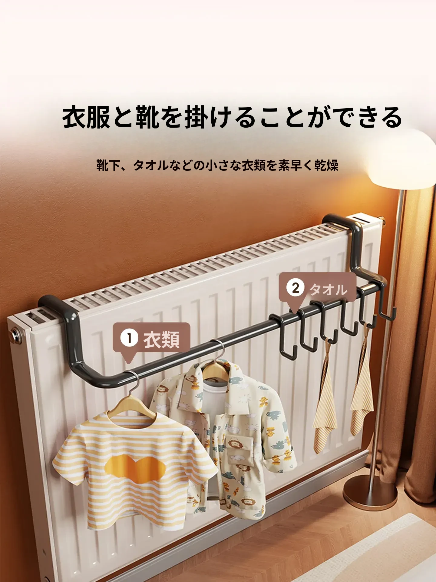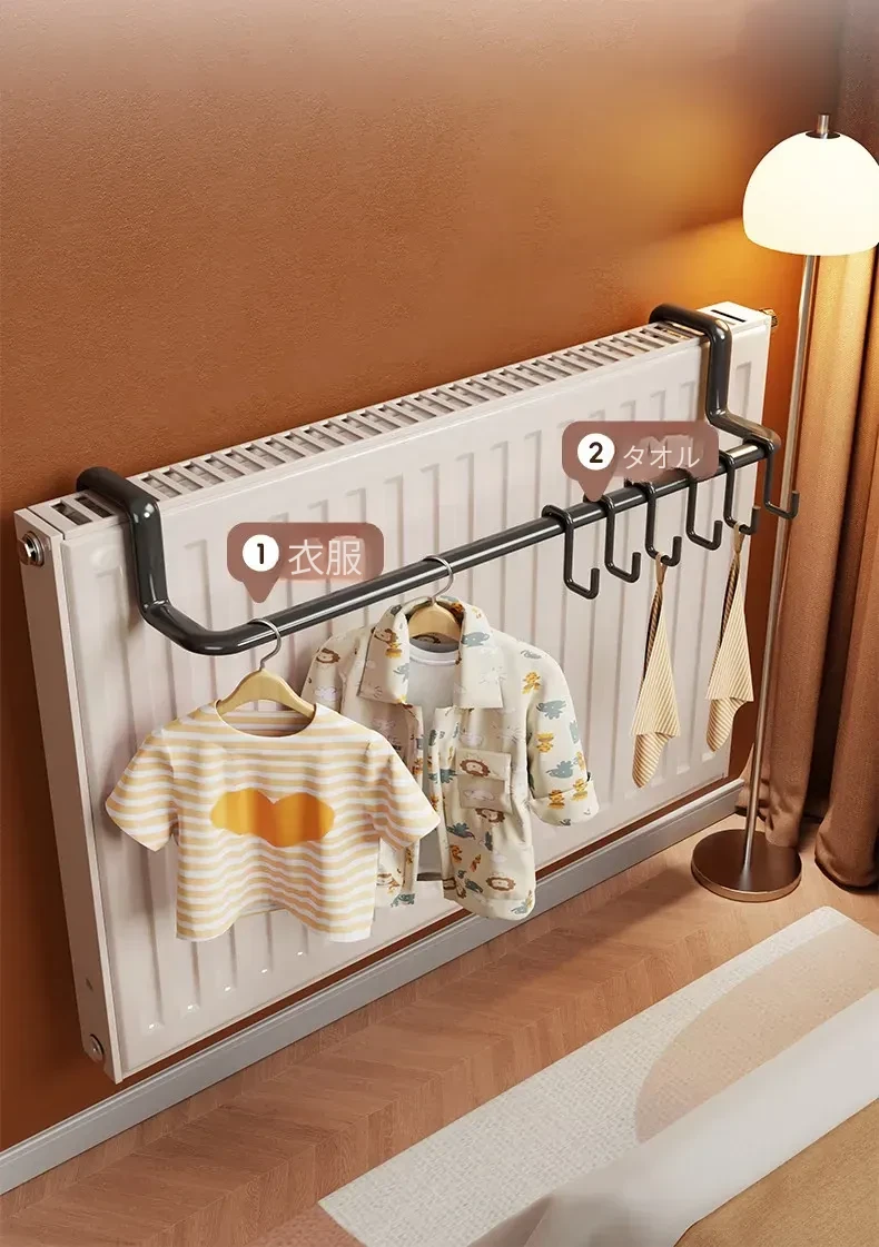 バスルーム専用暖房パイプ収納フック!穴を開けずに簡単取り付け、タオルや衣類をすっきり収納できる便利なアイテム。暖かい空間でおしゃれに整理整頓しませんか?