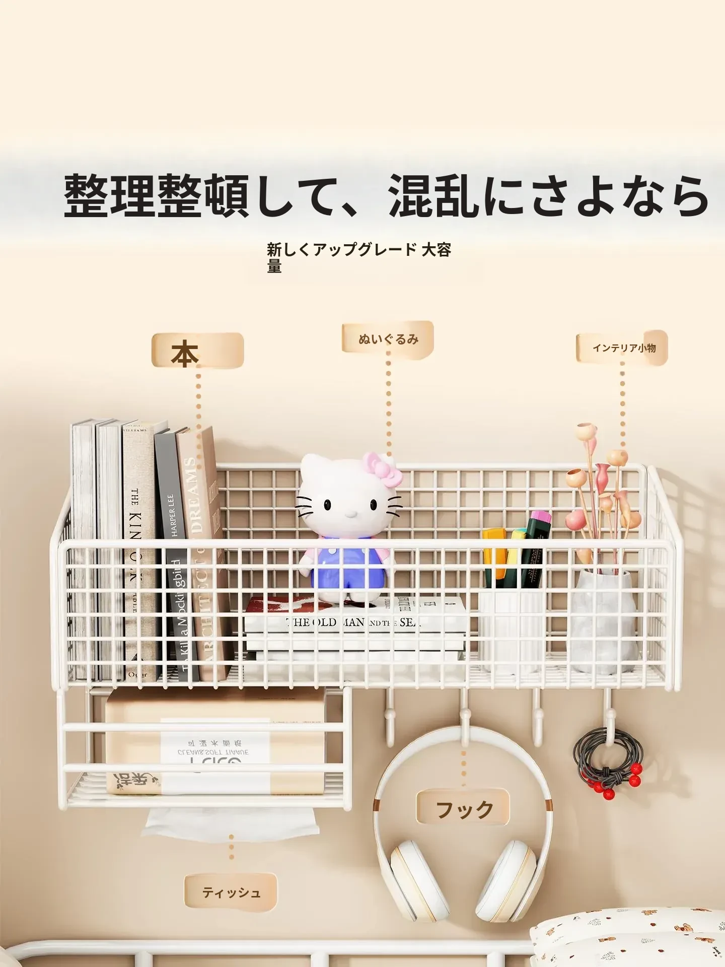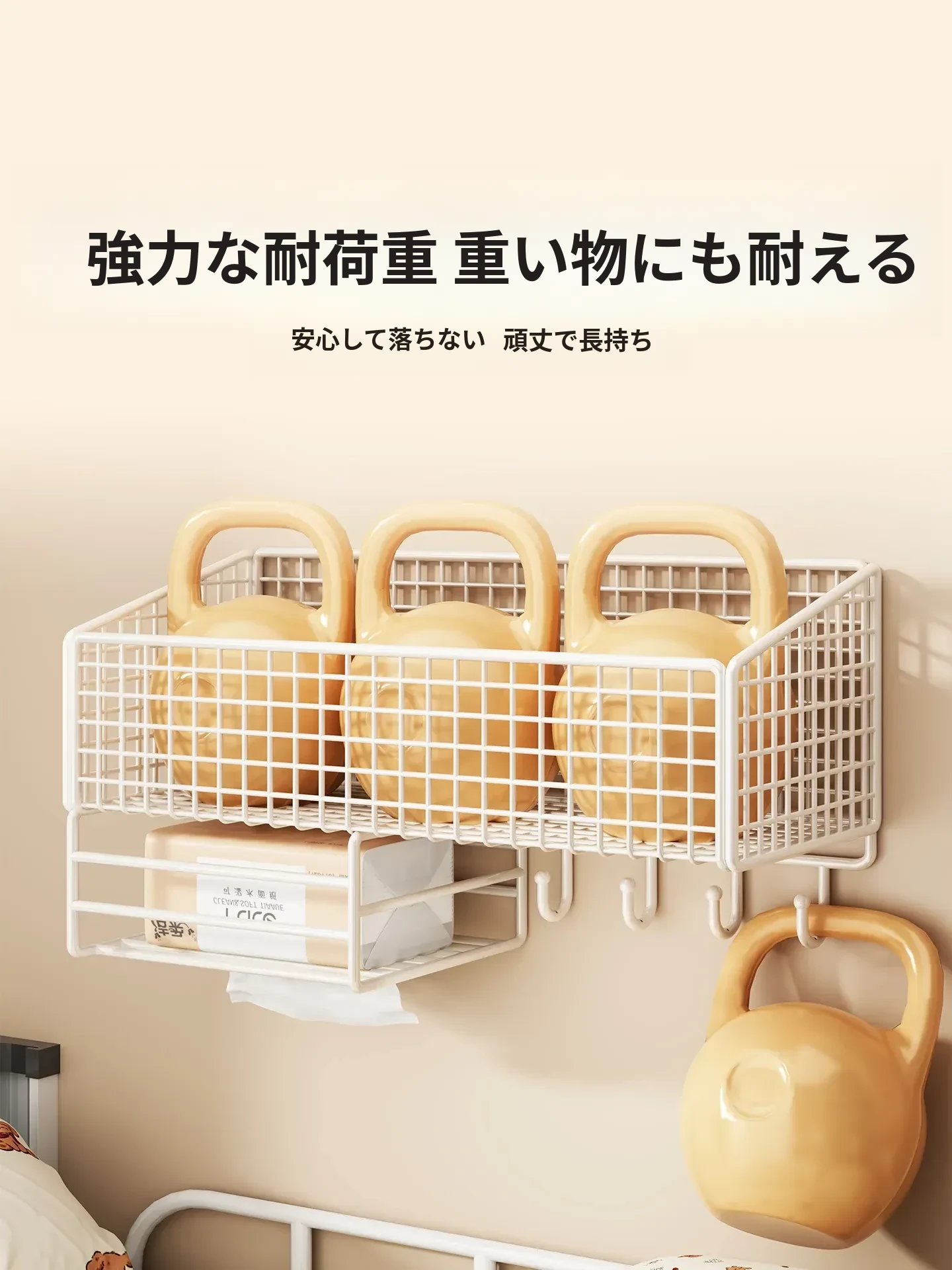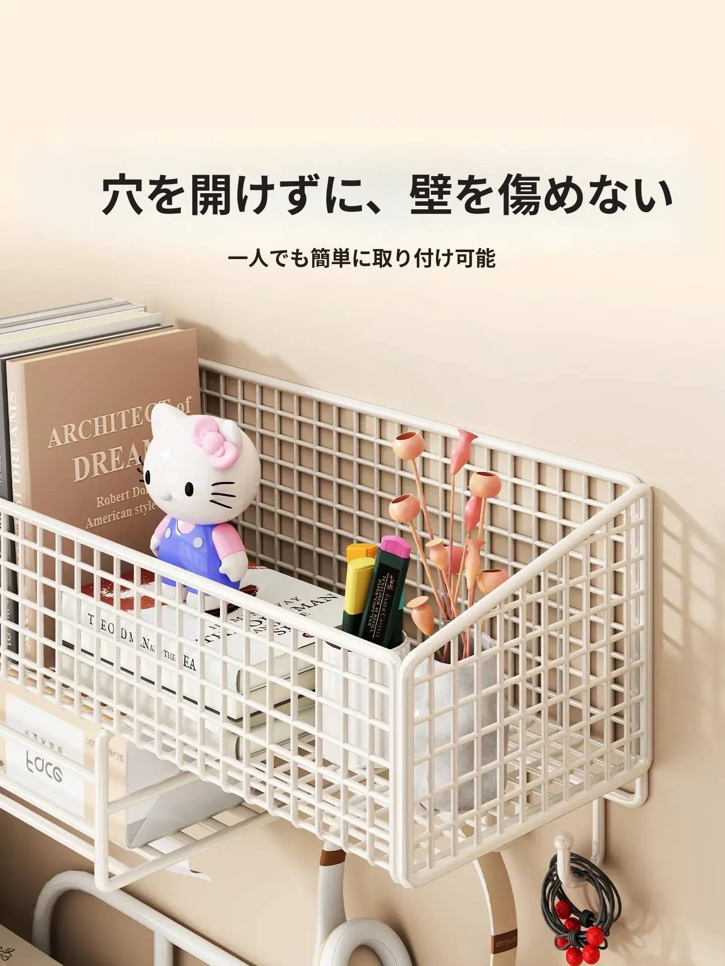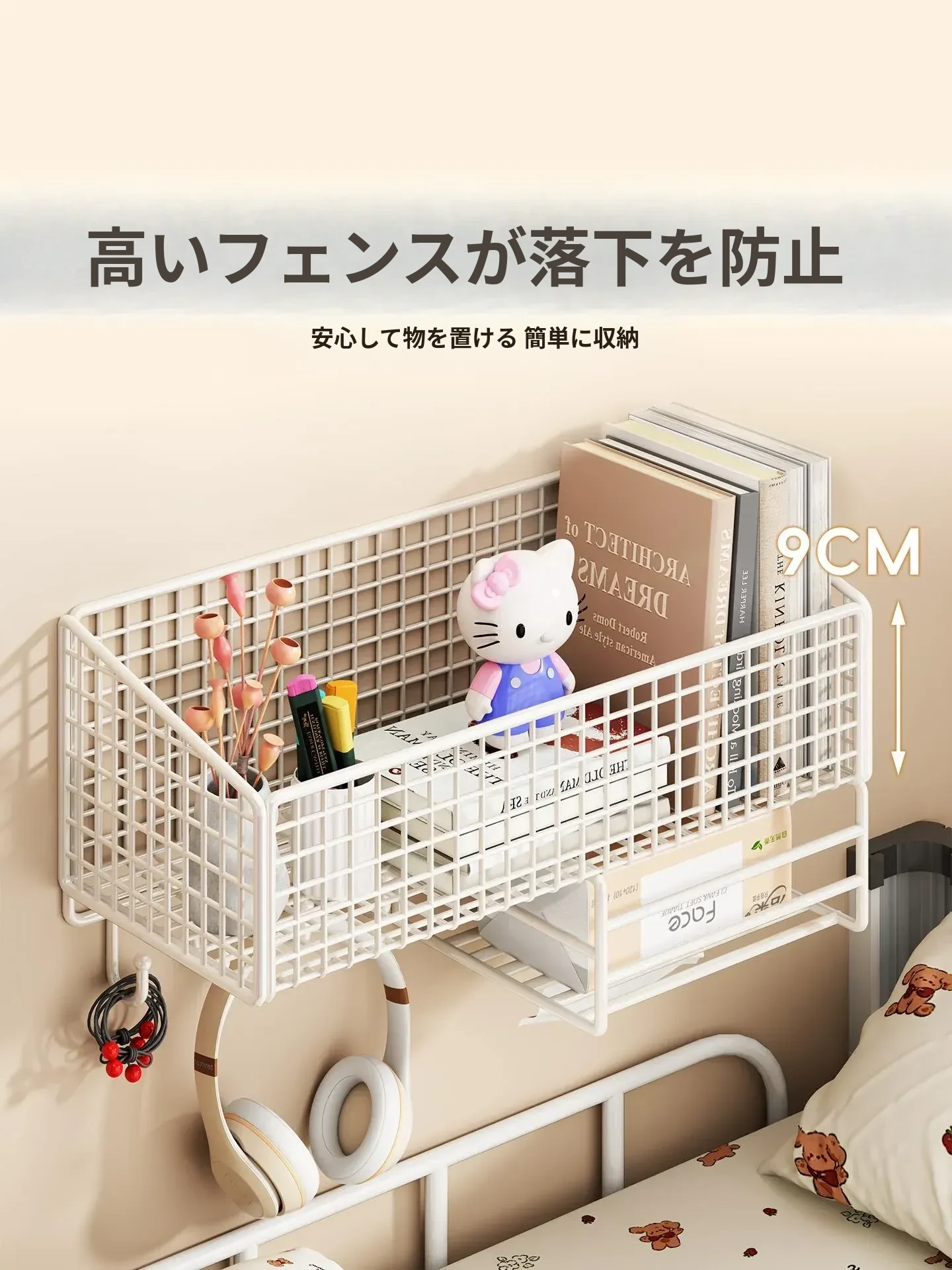 大学生のための宿舎用壁掛け収納ラック!穴を開けずに簡単取り付け、ベッドサイドや壁面にぴったりフィット。おしゃれで便利な収納バスケットで、寝室をスッキリ整理整頓!