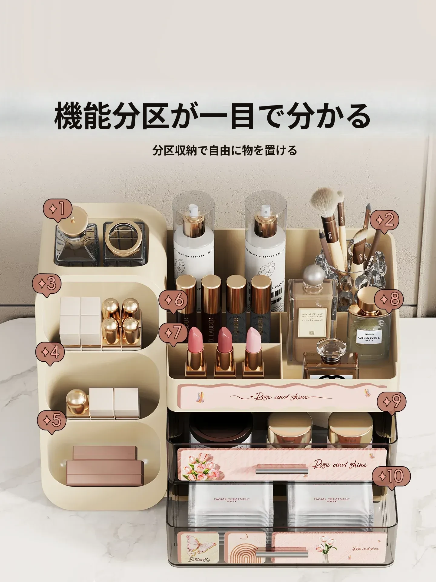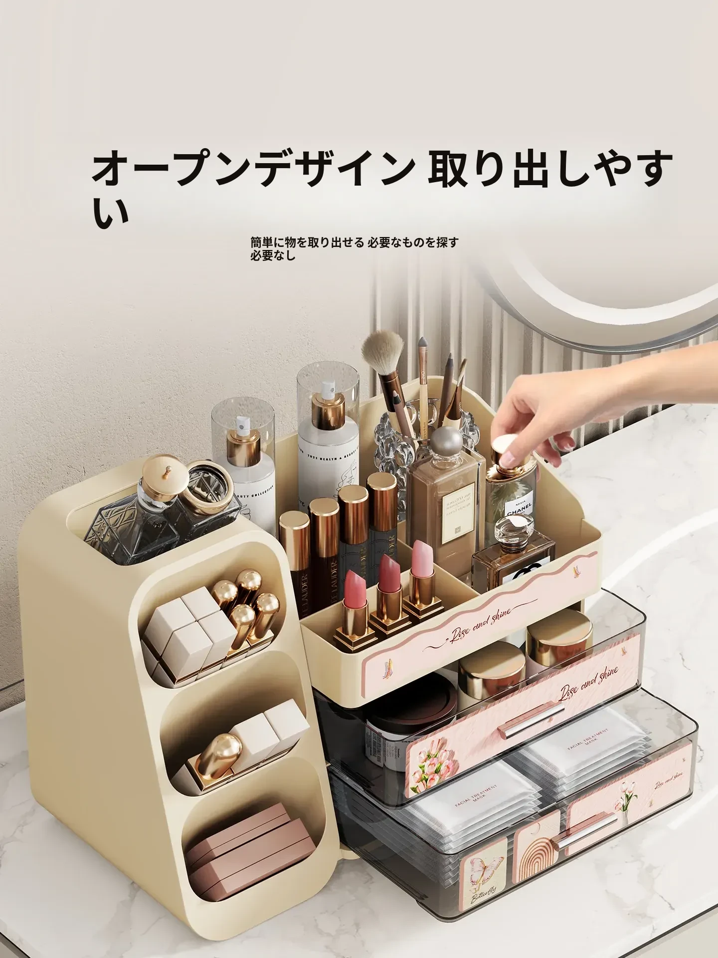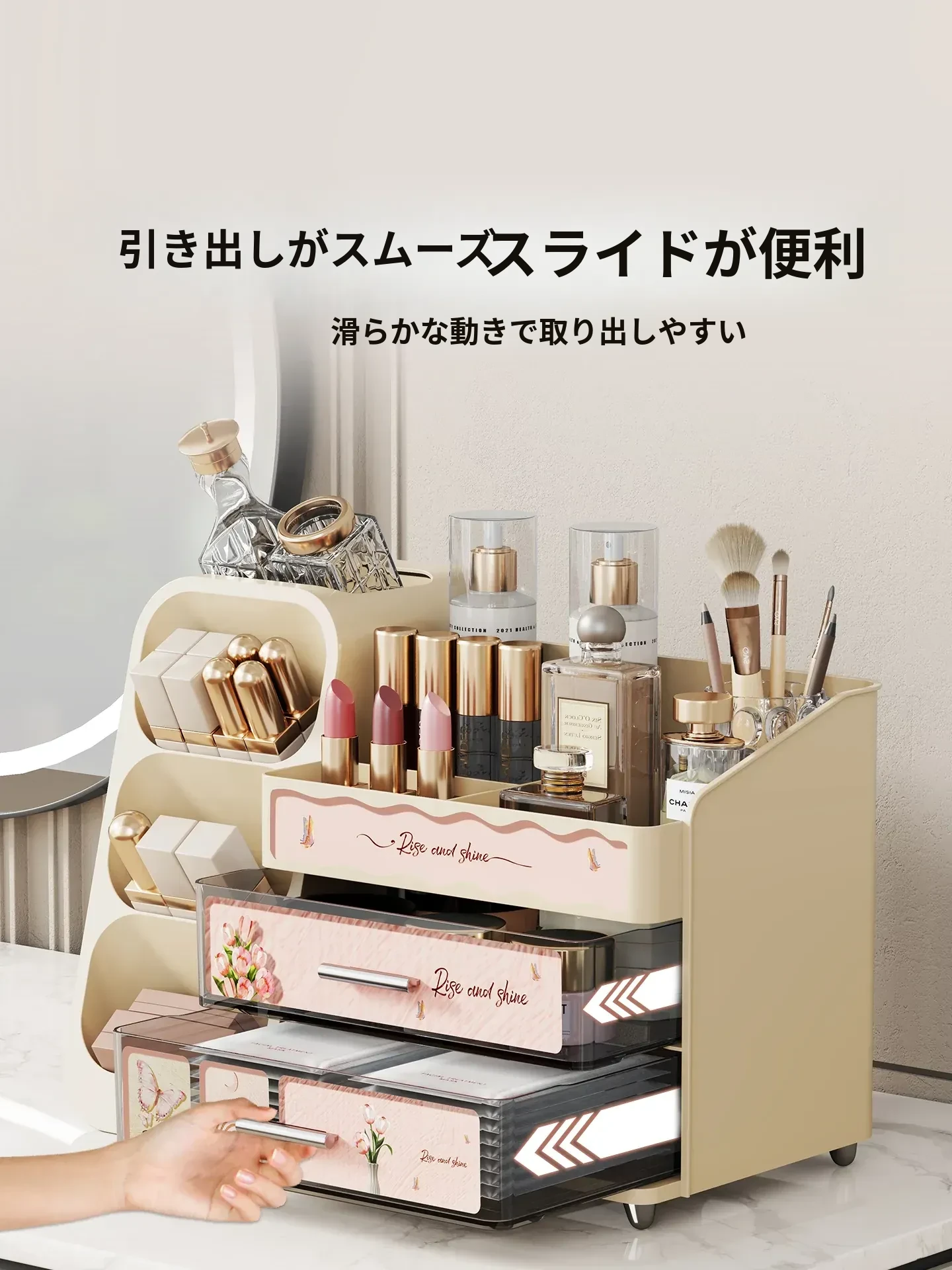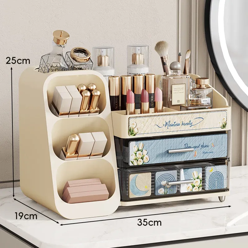 高級感溢れる大容量化粧品収納ボックス - メイク台の引き出しにぴったり!リップやスキンケアをスマートに整理できるスタイリッシュな収納ラック。あなたのビューティー空間を華やかに演出します!
