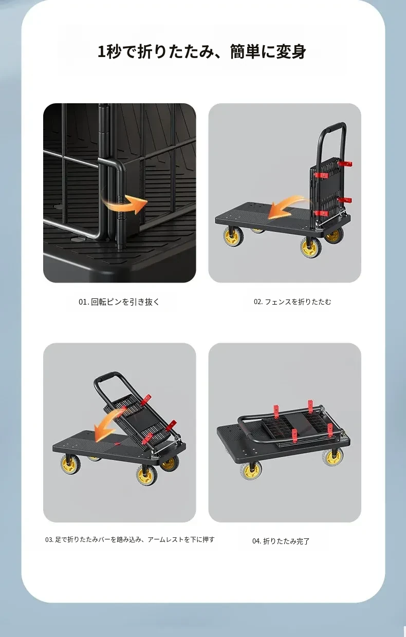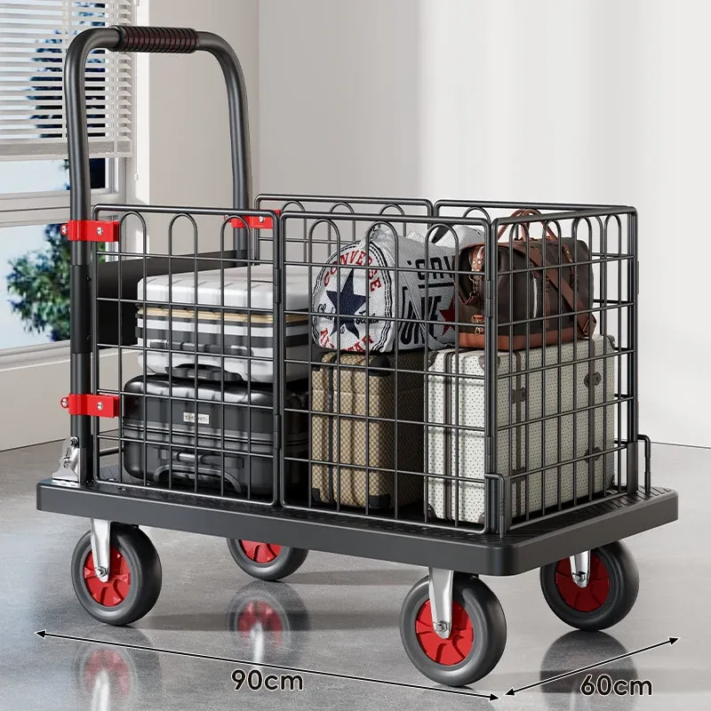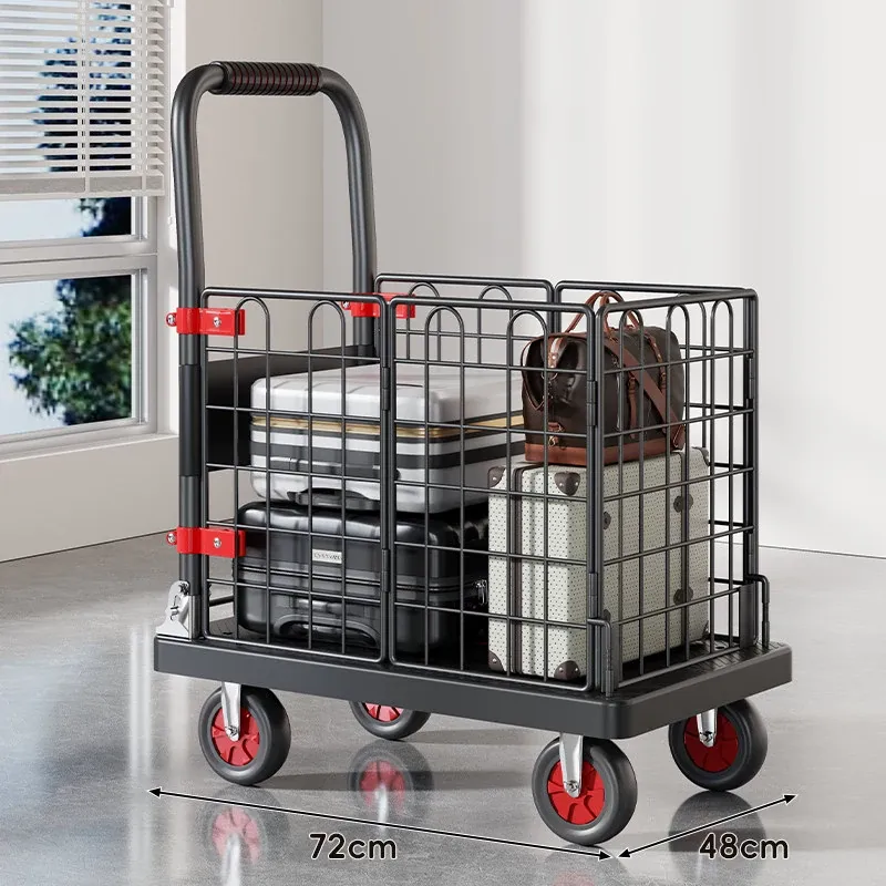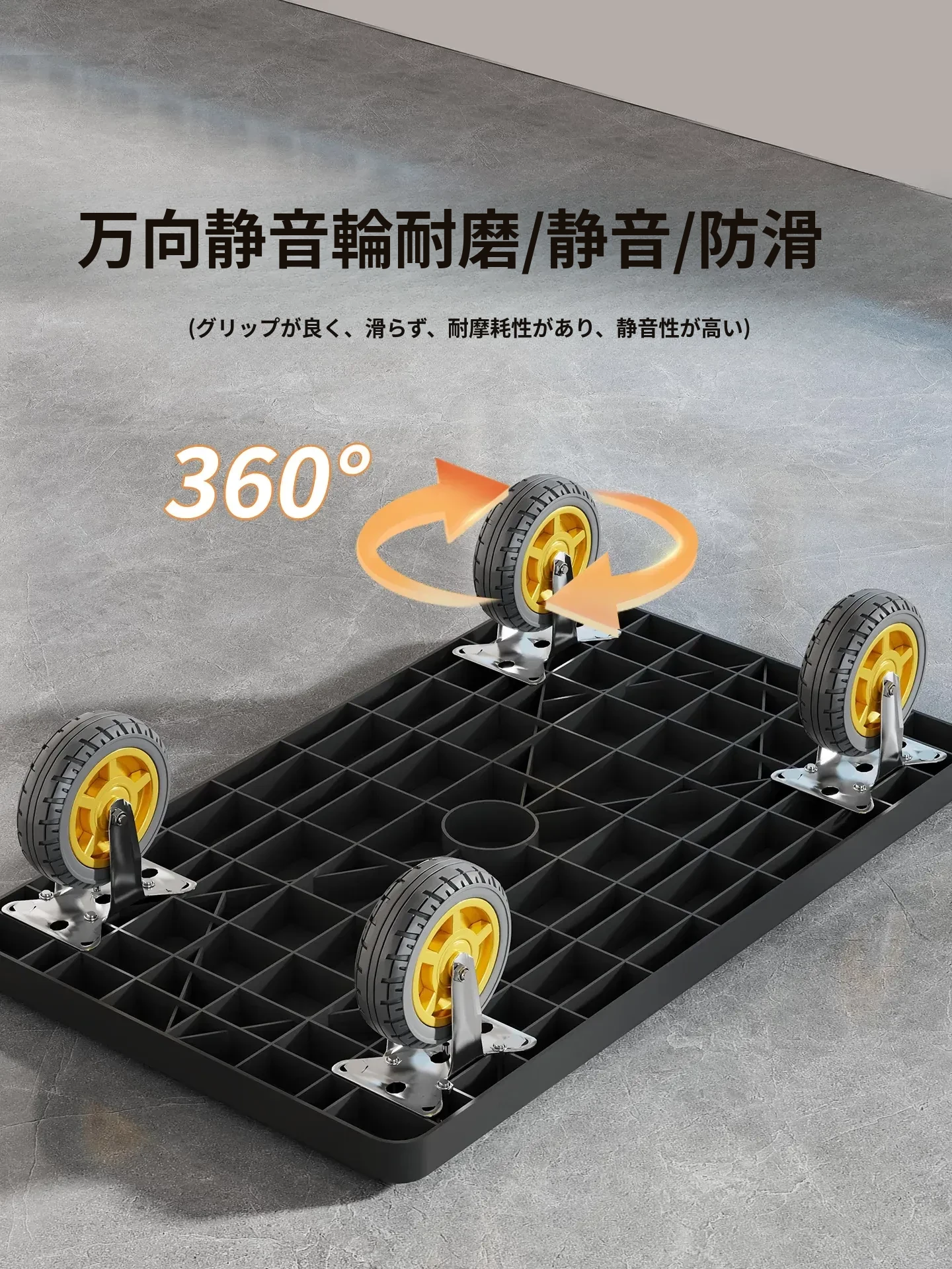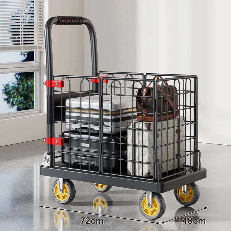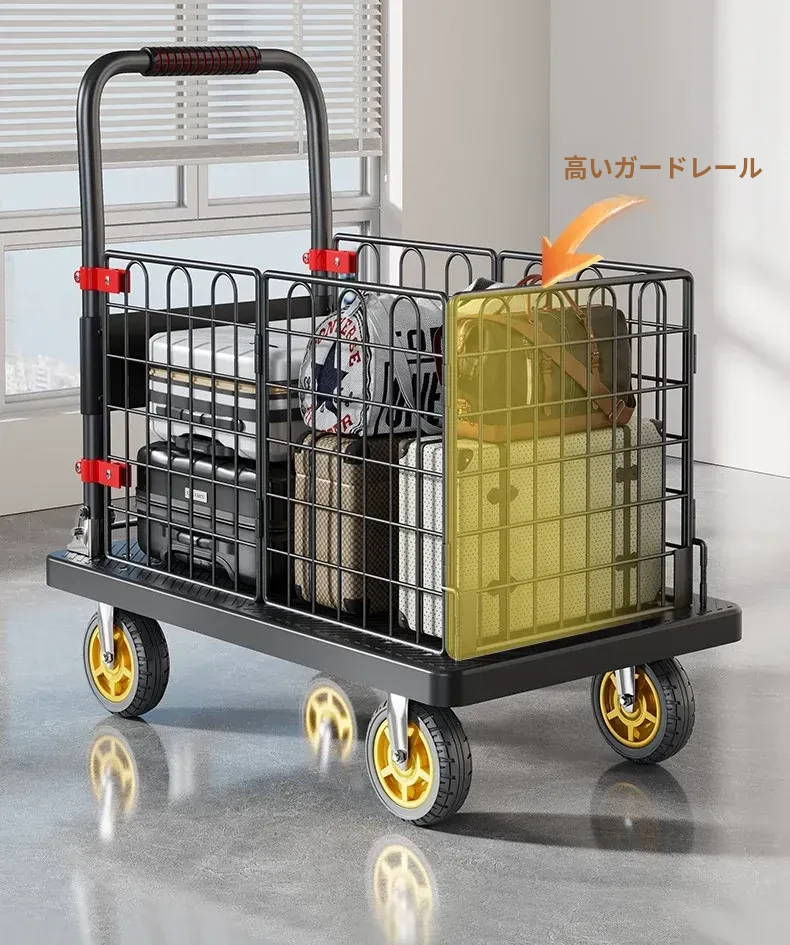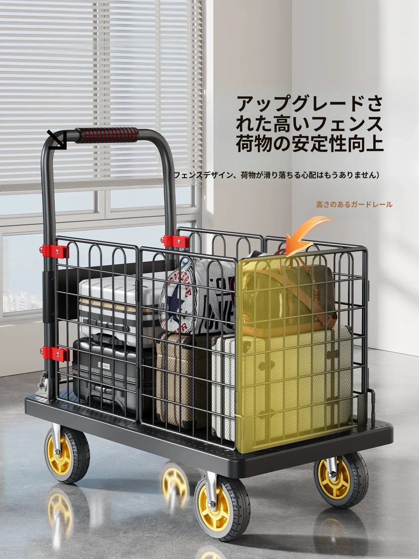 折りたたみ式静音4輪ガーデンカート - フェンス付き平台車で、荷物運びや宅配の便利アイテム!手軽に運べて、収納も簡単。快適な運搬体験をどうぞ!