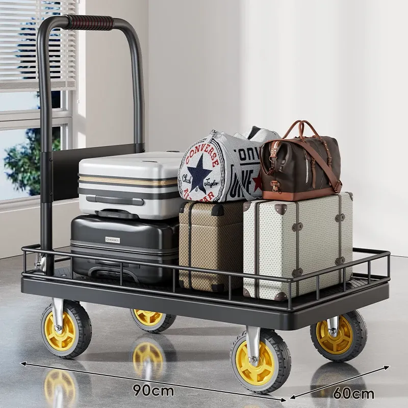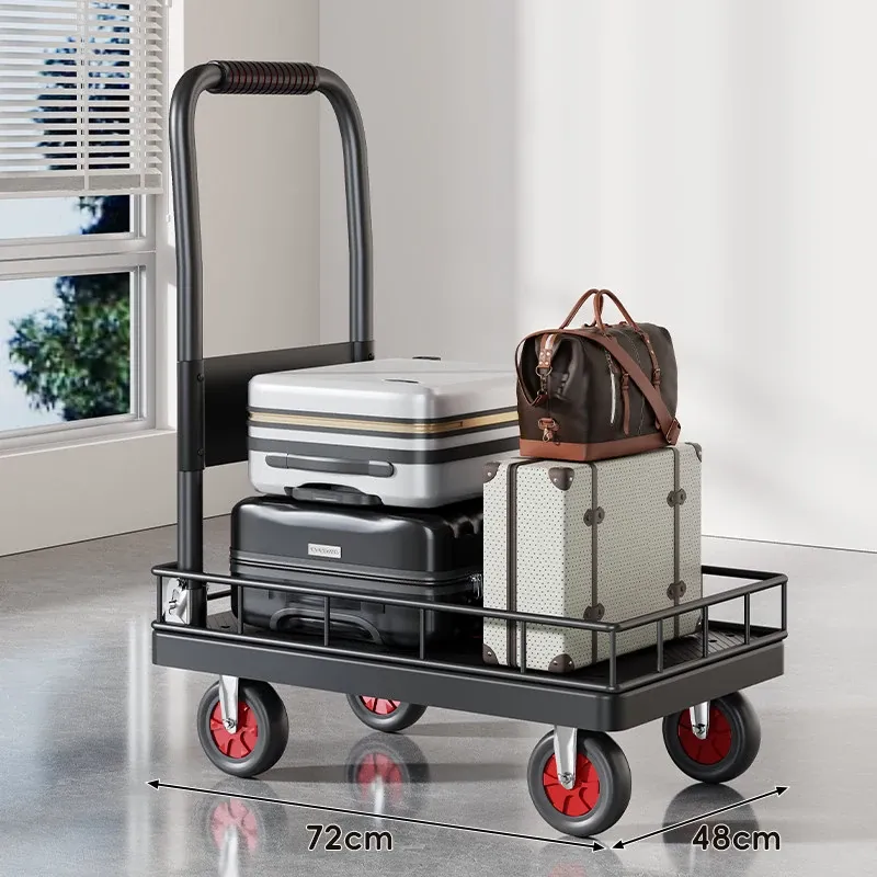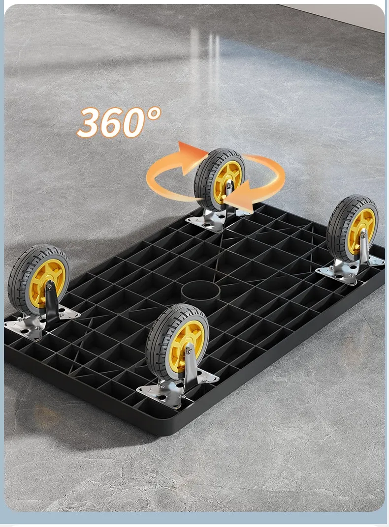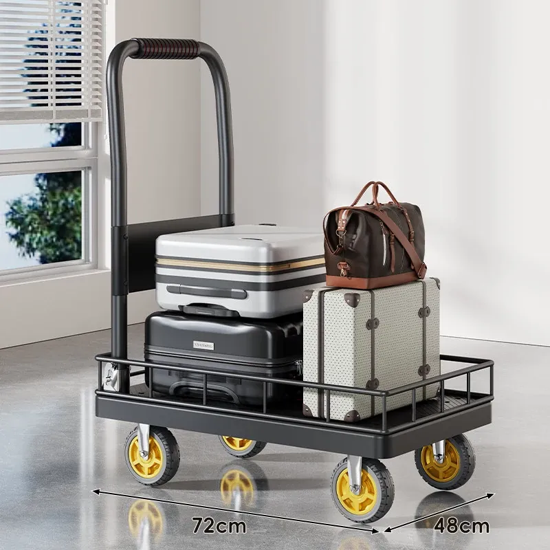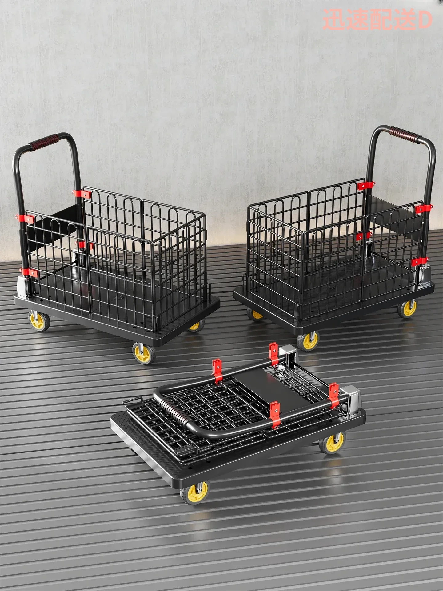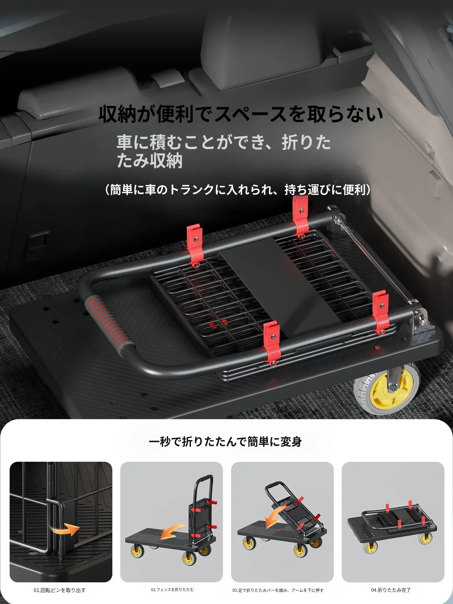 折りたたみ式静音4輪ガーデンカート - フェンス付き平台車で、荷物運びや宅配の便利アイテム!手軽に運べて、収納も簡単。快適な運搬体験をどうぞ!