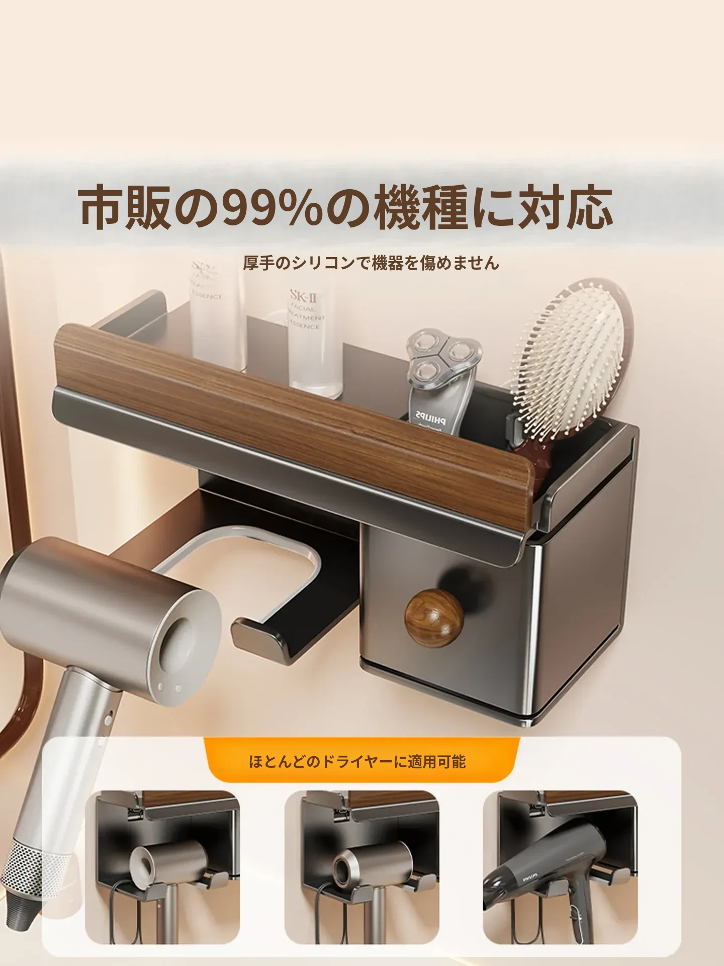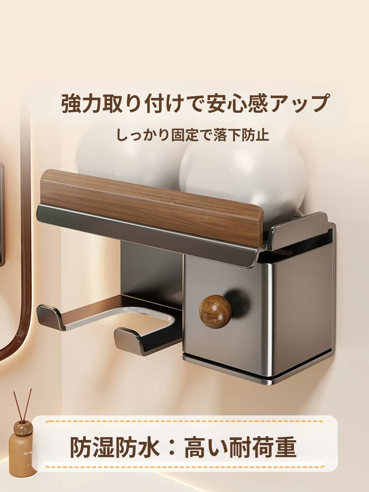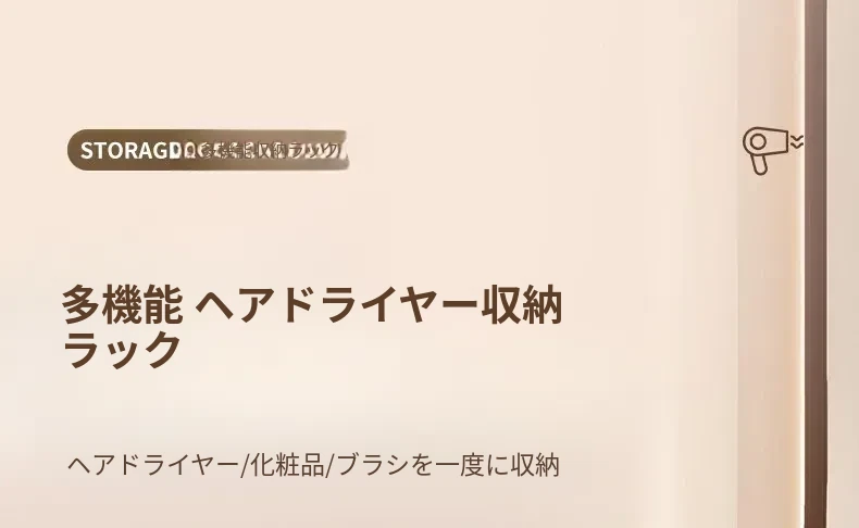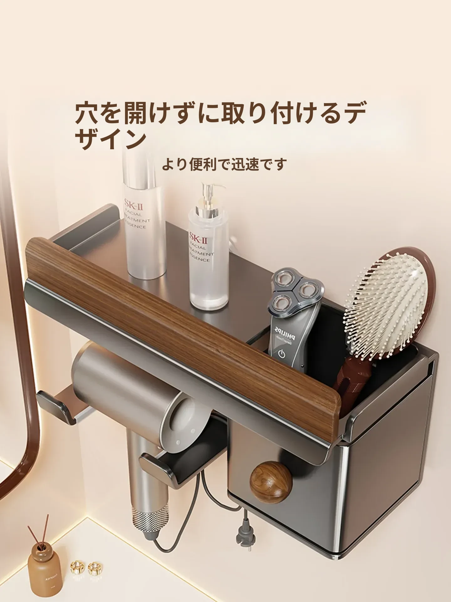 穴あけ不要!バスルームや洗面台にぴったりなドライヤー収納ラック - スタイリッシュで便利な掛け式収納で、スッキリとした空間を実現!