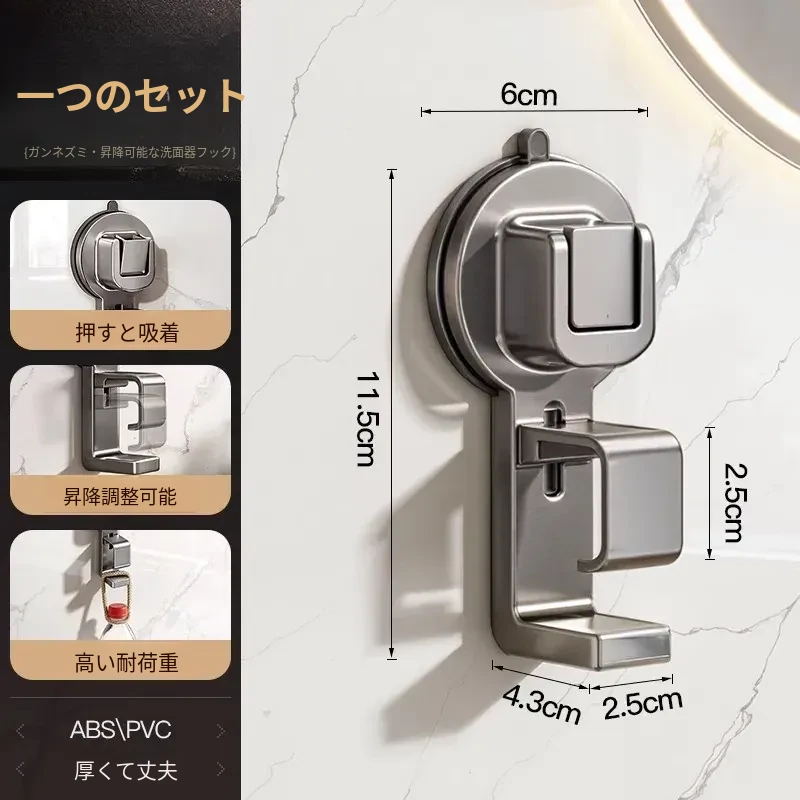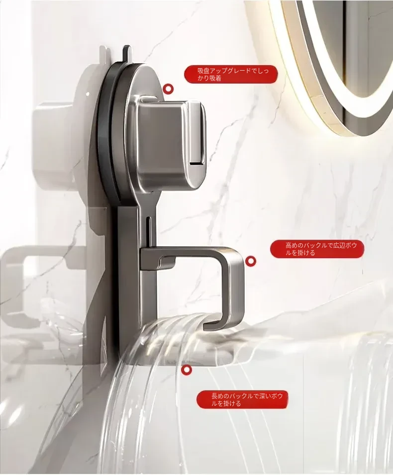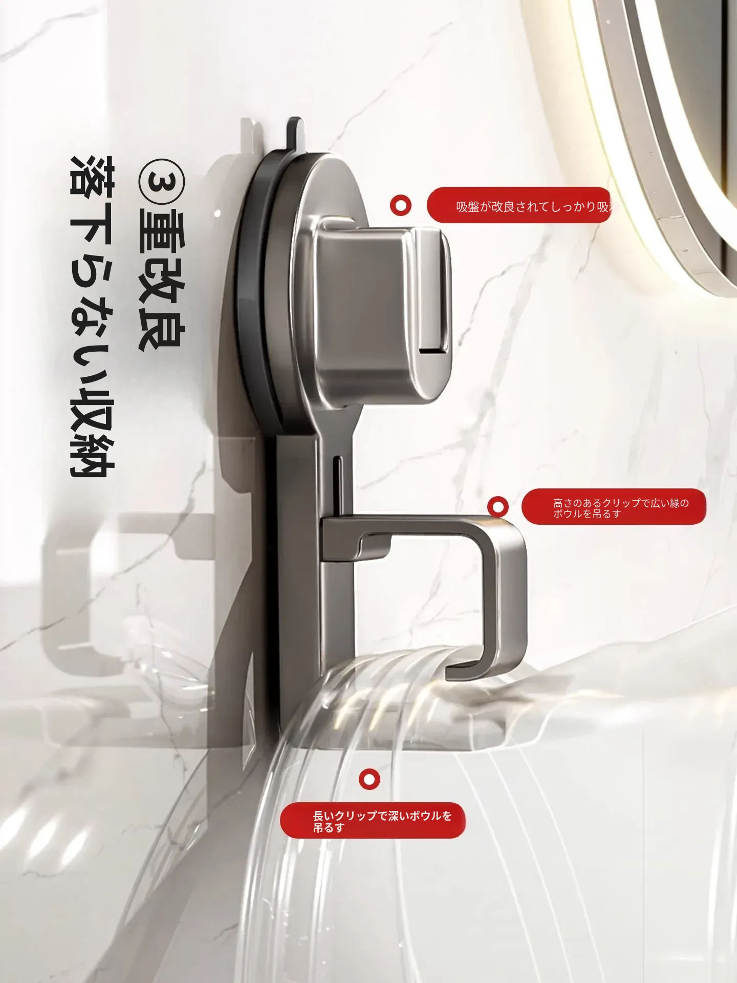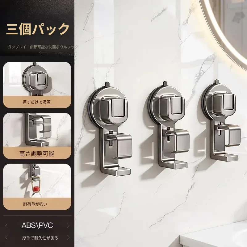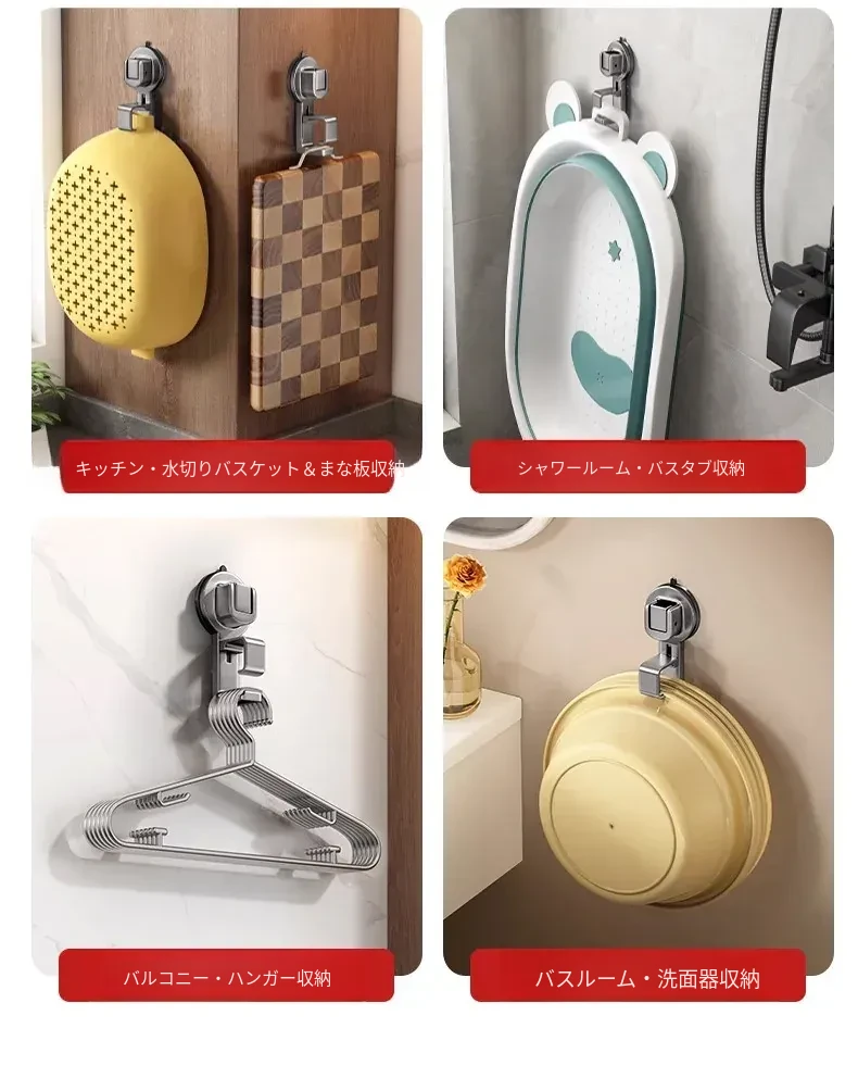 穴あけ不要!驚異の吸着力でトイレや洗面所にぴったりのフック・洗面器ラック。家のスペースを有効活用できる壁掛け収納!