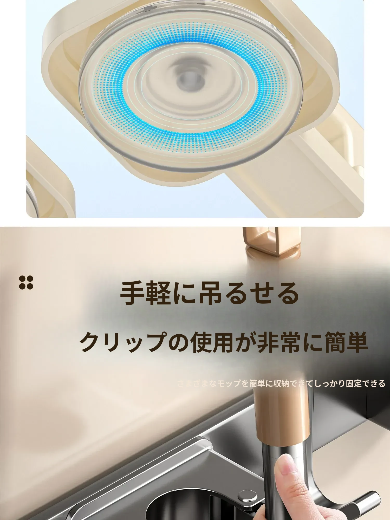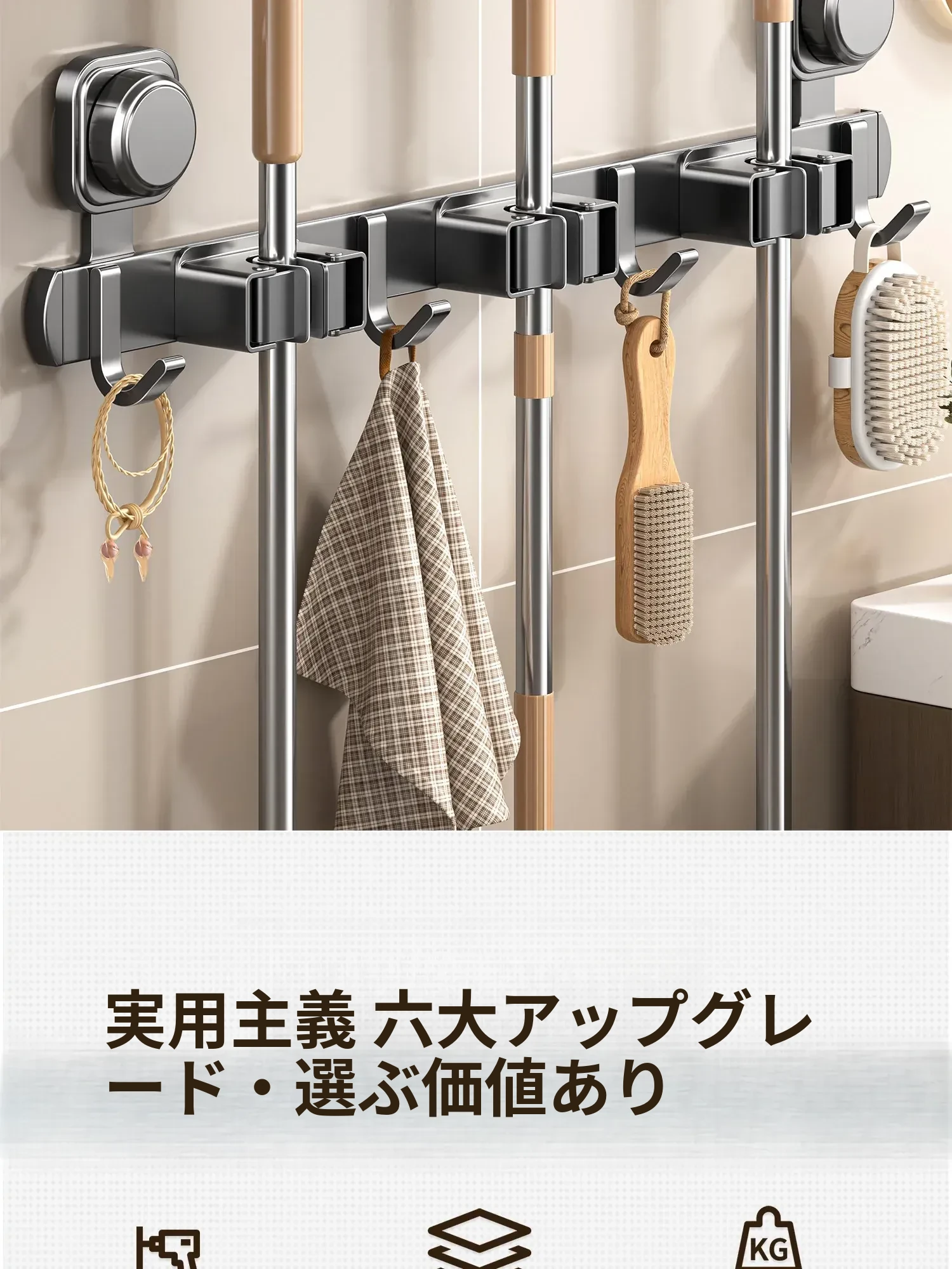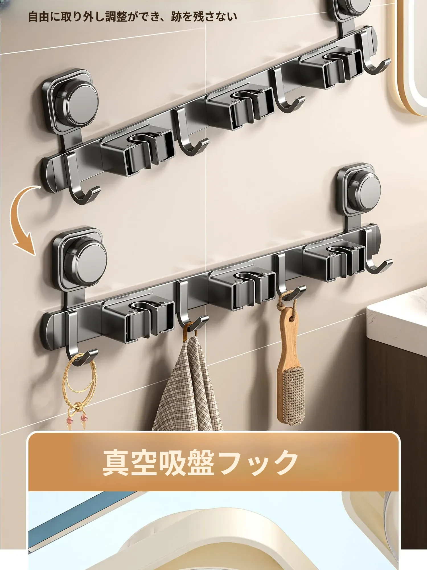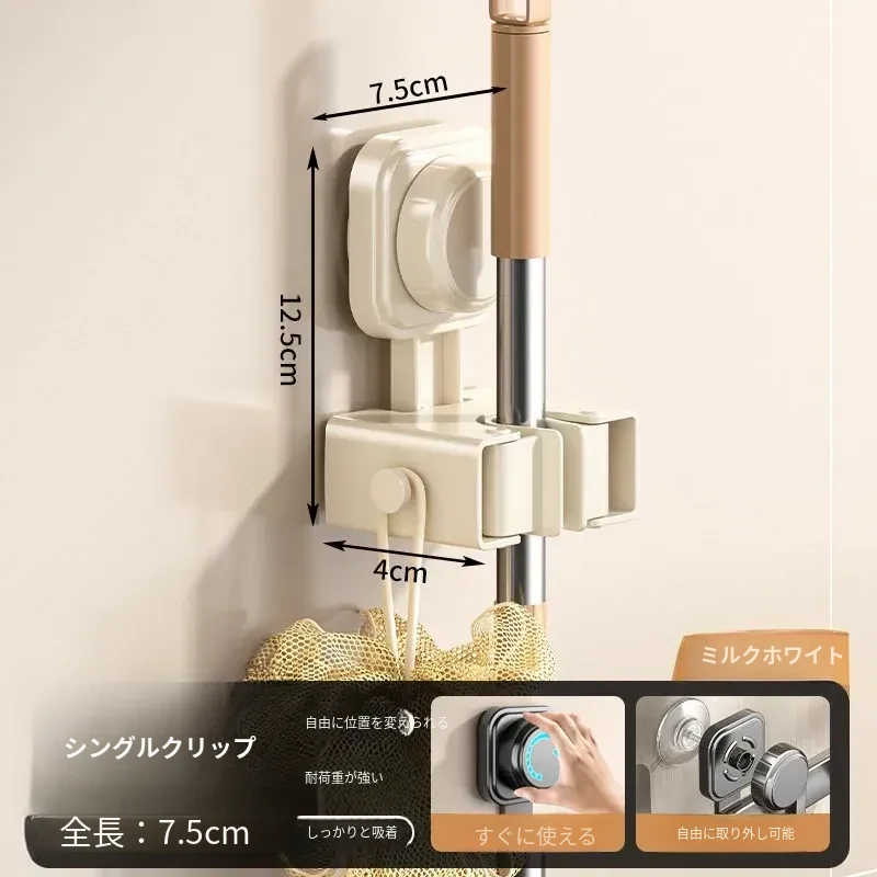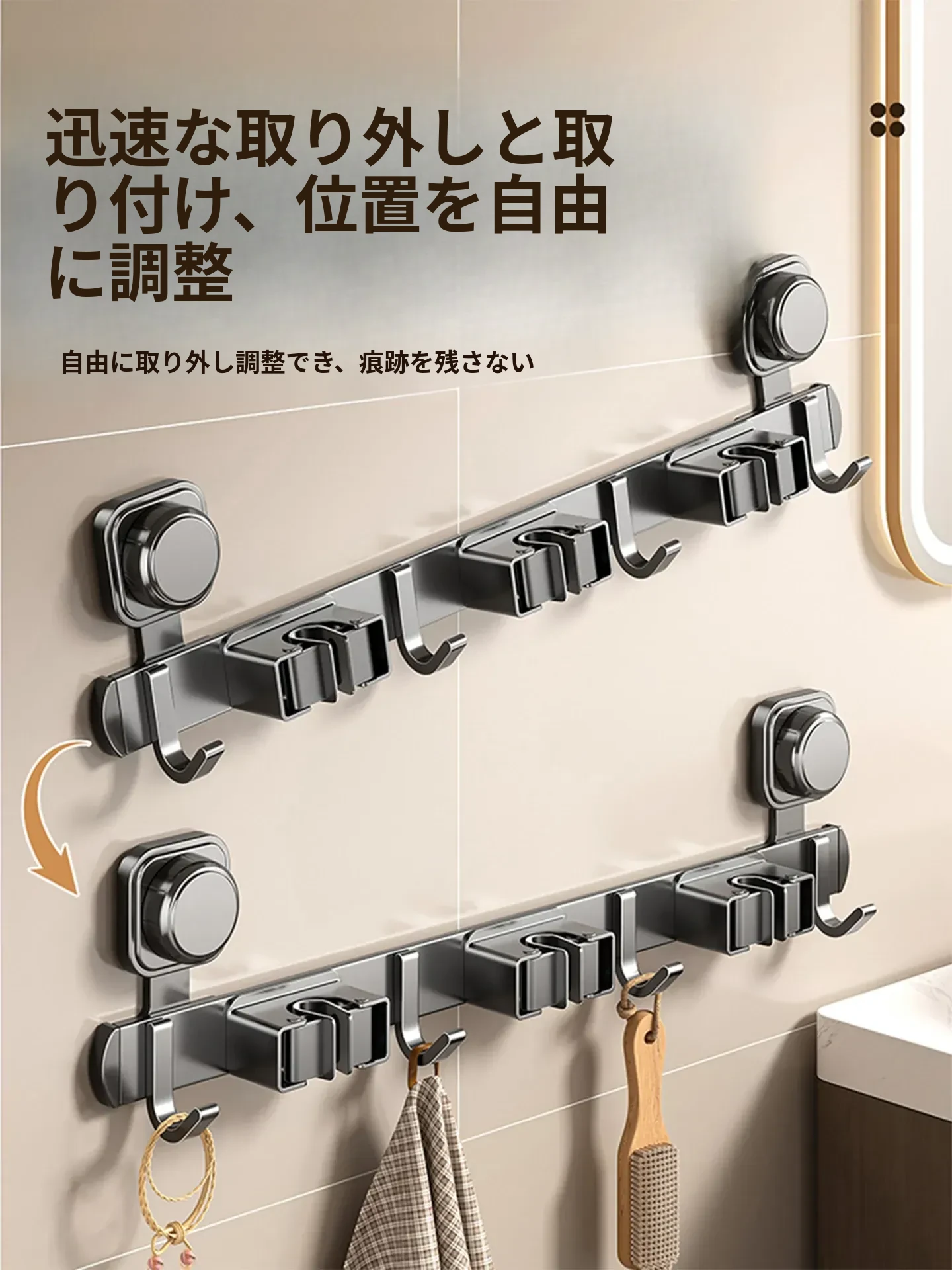 穴あけ不要!強力壁掛けモップホルダー - バスルームやトイレに最適な掃除道具収納フック!吸盤式で取り付け簡単、すっきり整理整頓!