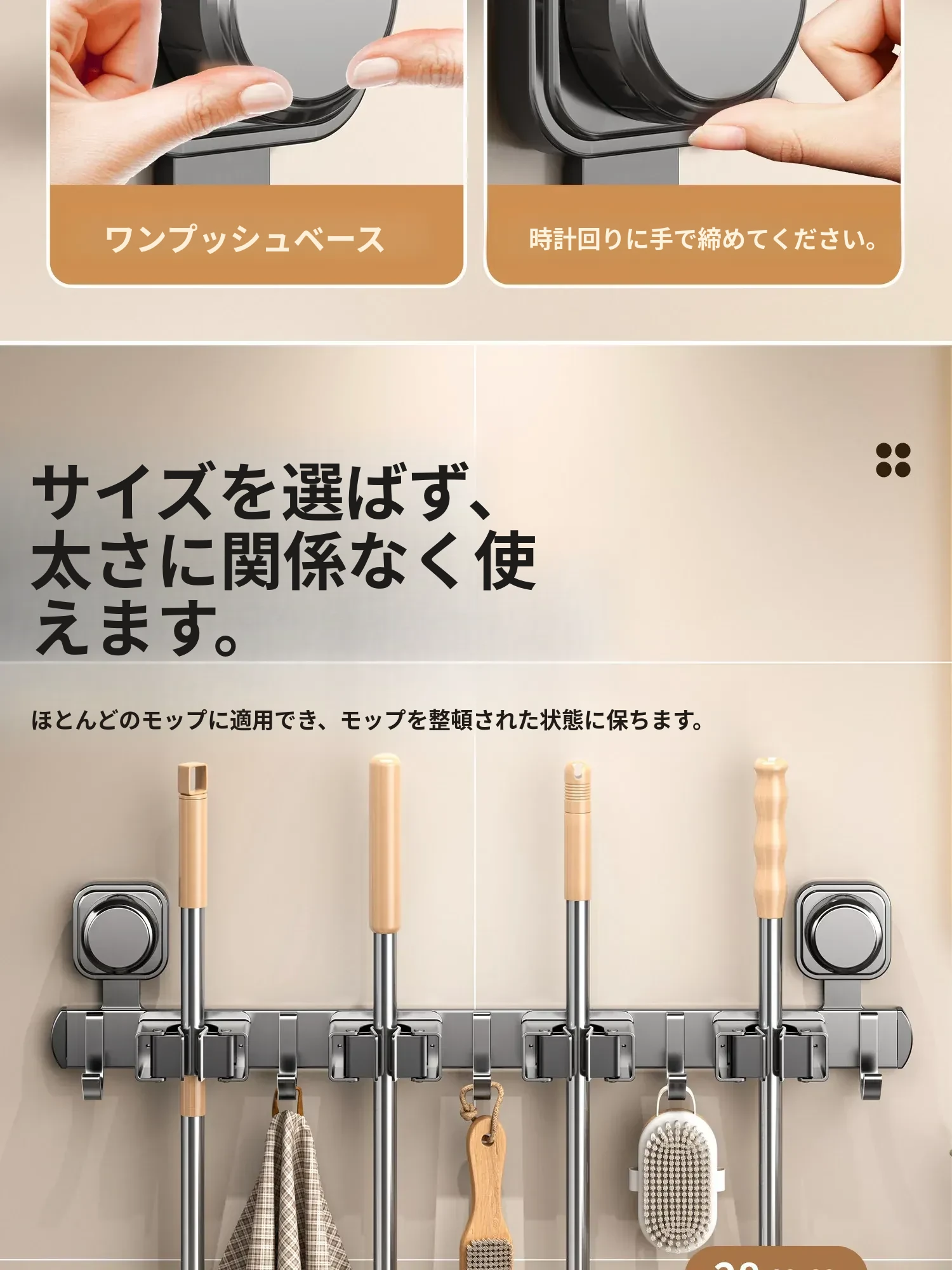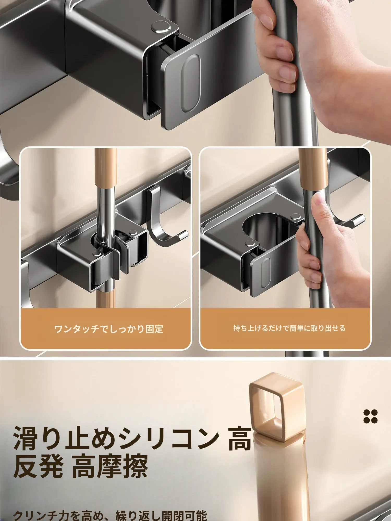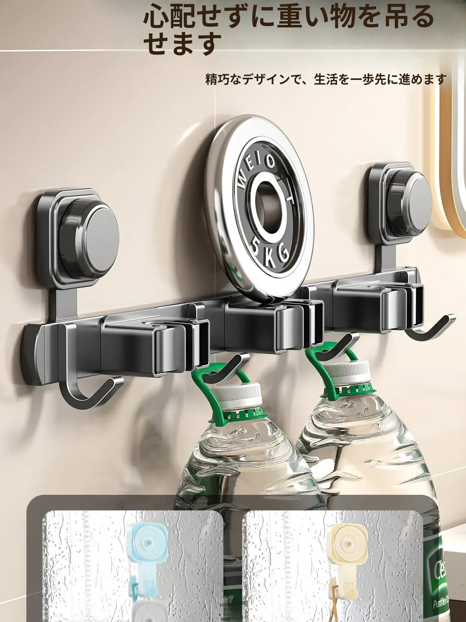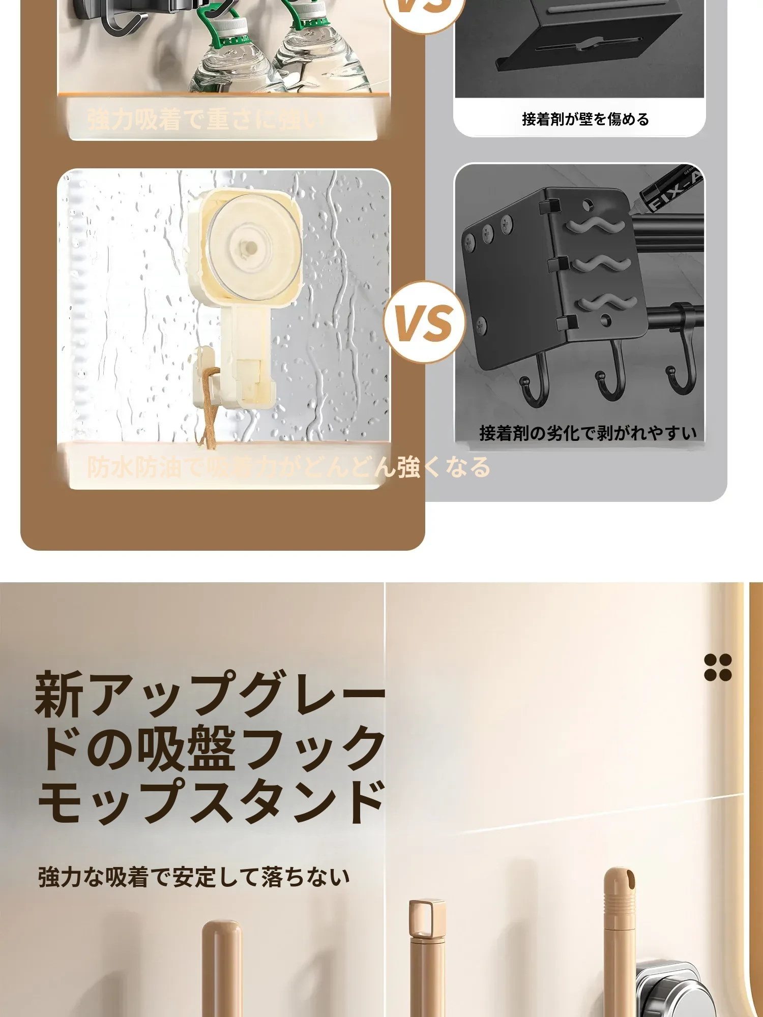 穴あけ不要!強力壁掛けモップホルダー - バスルームやトイレに最適な掃除道具収納フック!吸盤式で取り付け簡単、すっきり整理整頓!