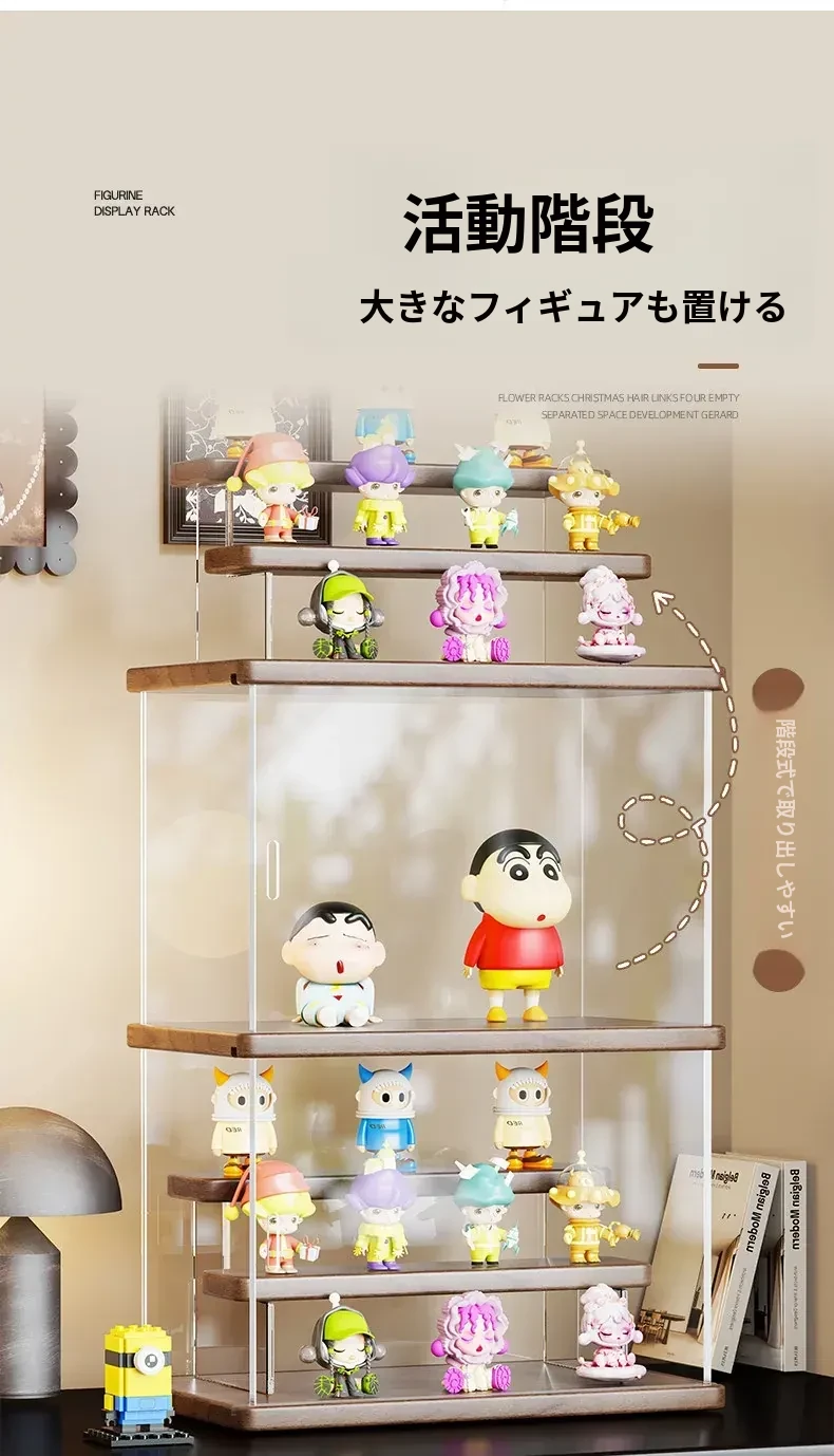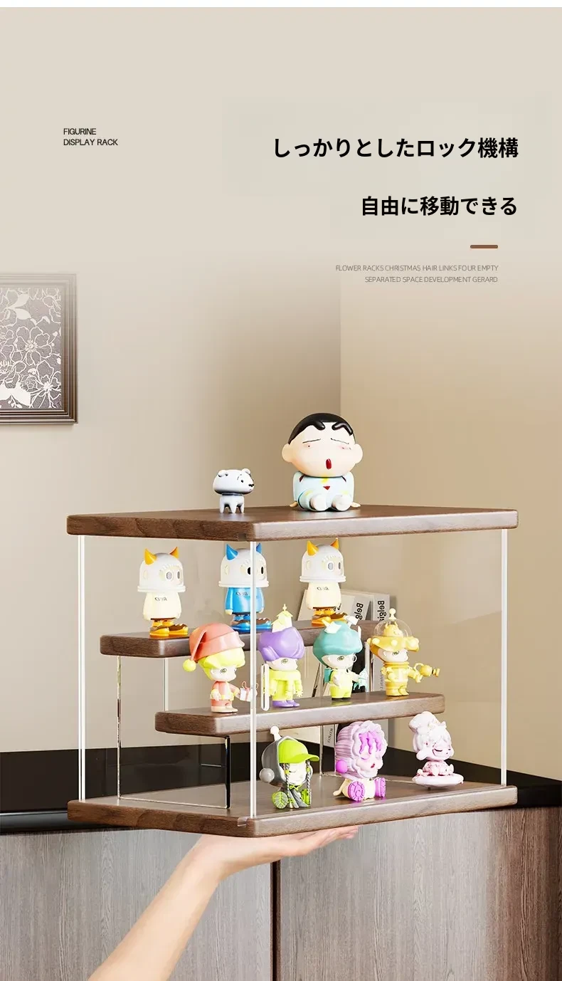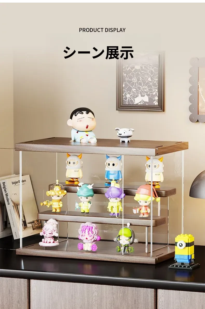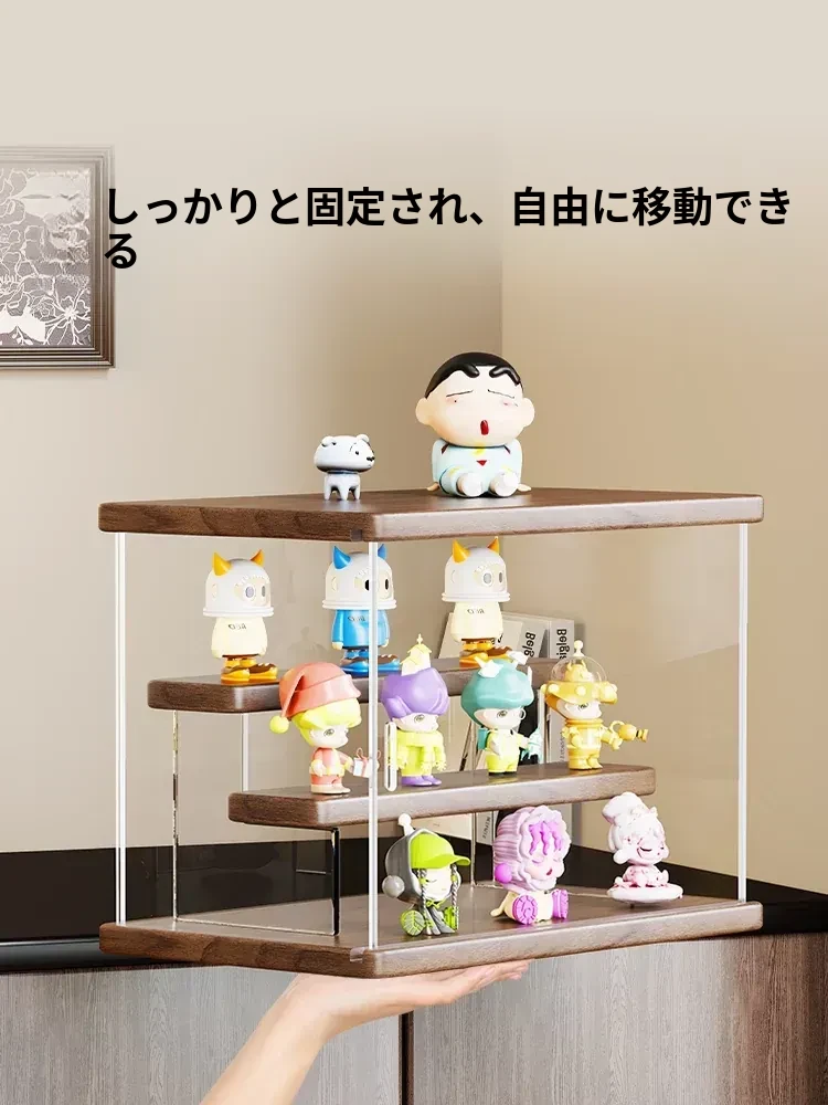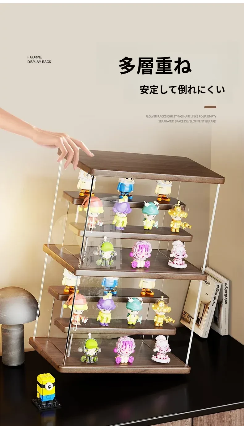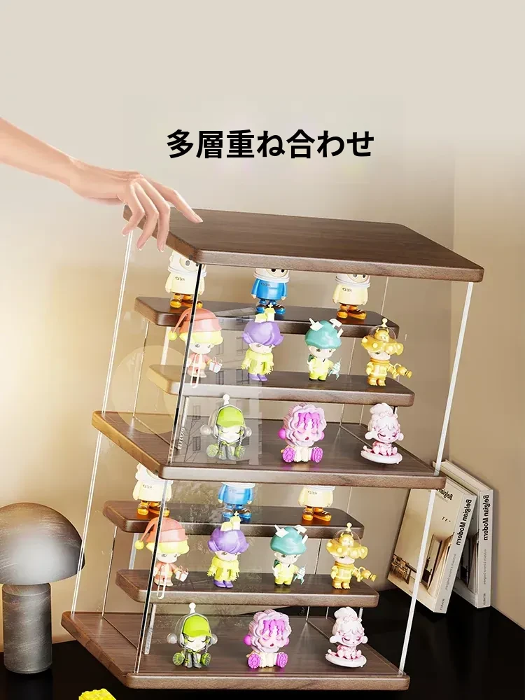 実木製ブラインドボックス収納ディスプレイラック、ポップマートのラブブー手作りフィギュアに最適!アクリル透明ステップディスプレイケースで、コレクションを美しく見せましょう。