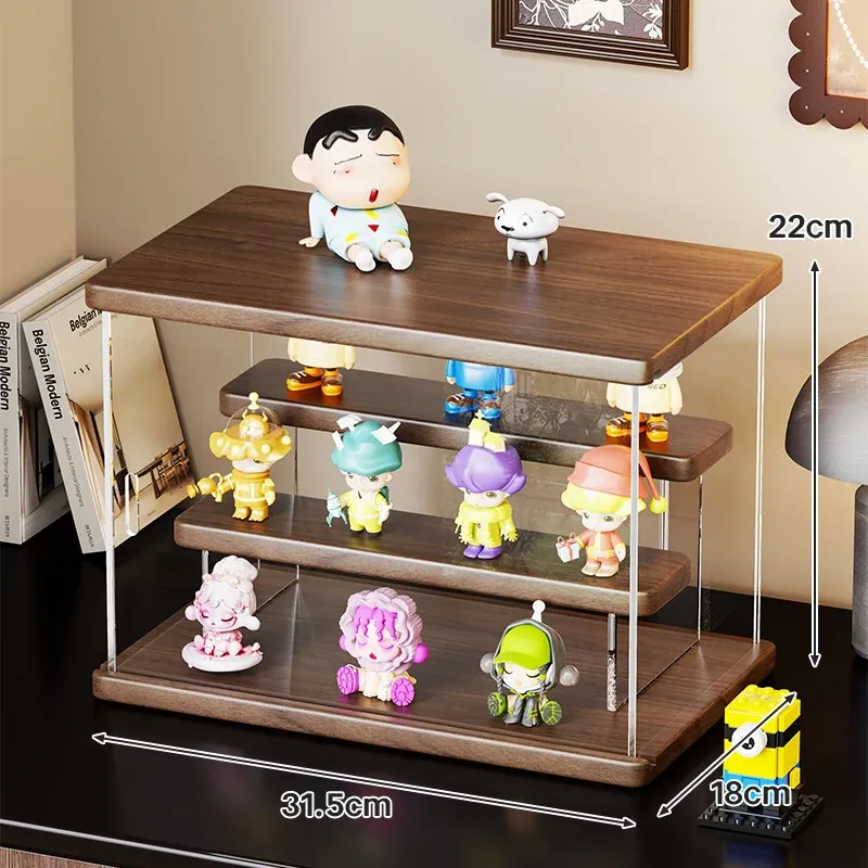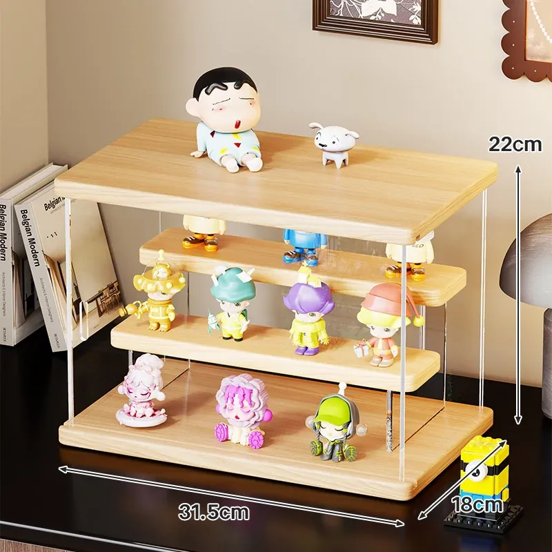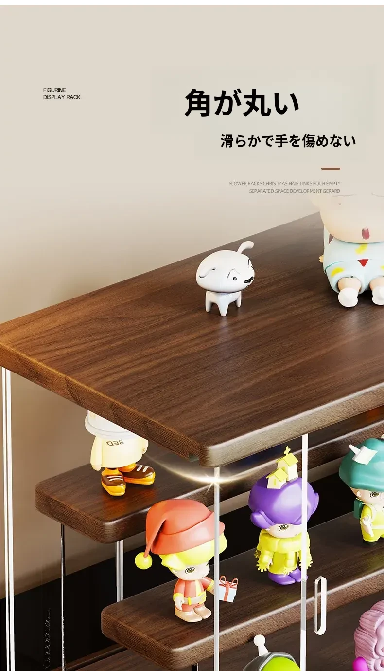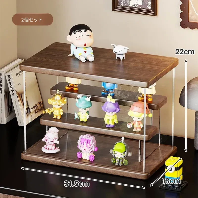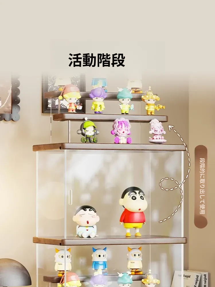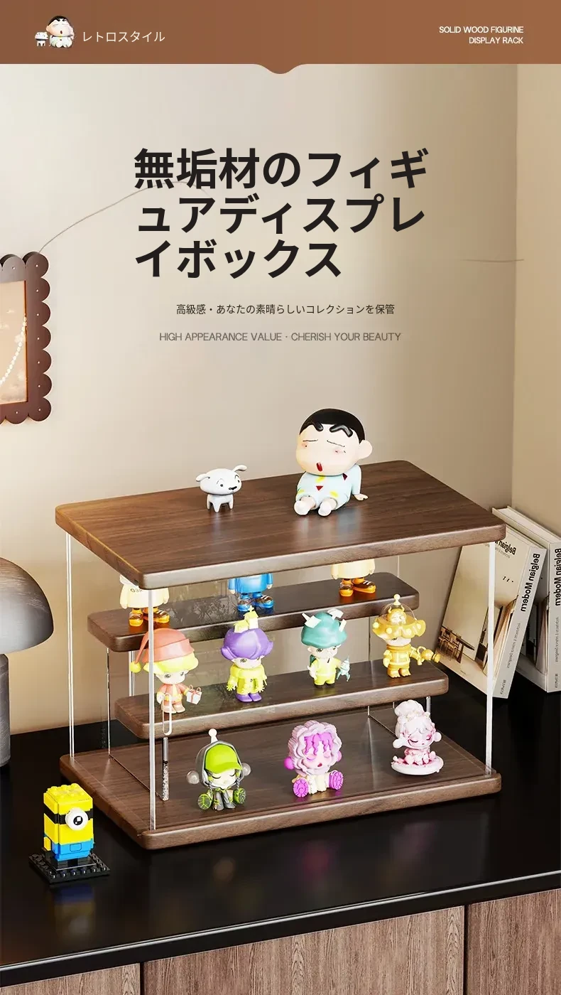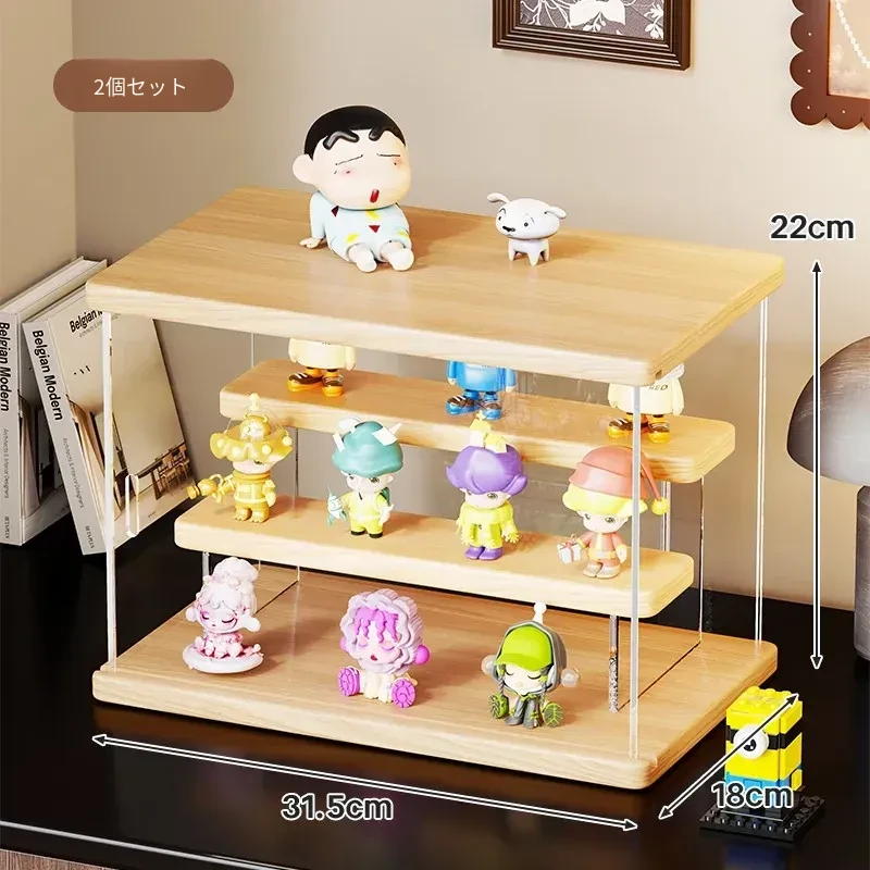 実木製ブラインドボックス収納ディスプレイラック、ポップマートのラブブー手作りフィギュアに最適!アクリル透明ステップディスプレイケースで、コレクションを美しく見せましょう。