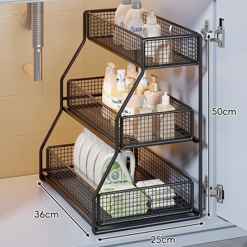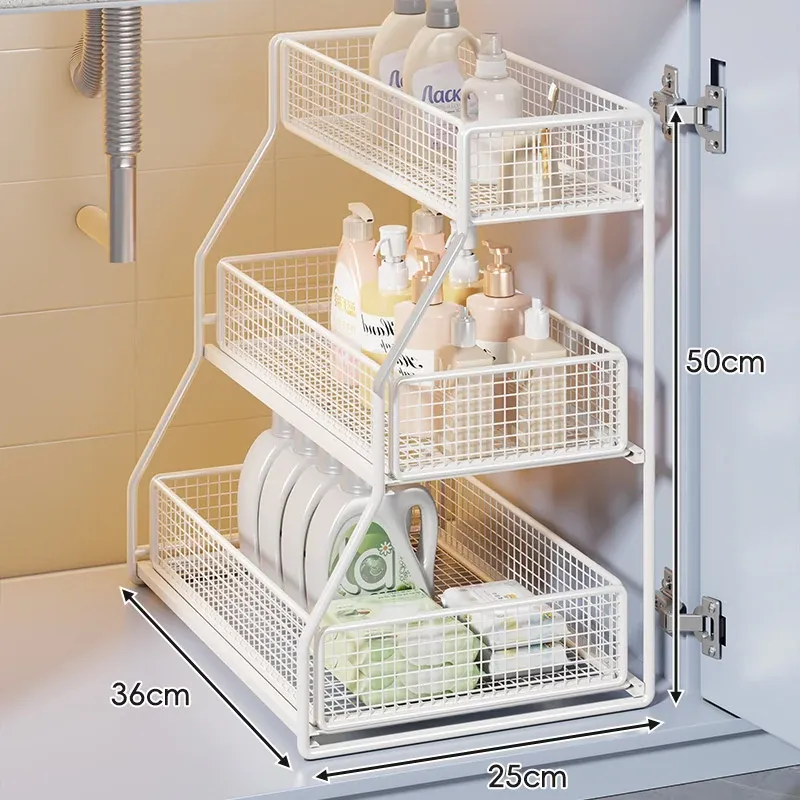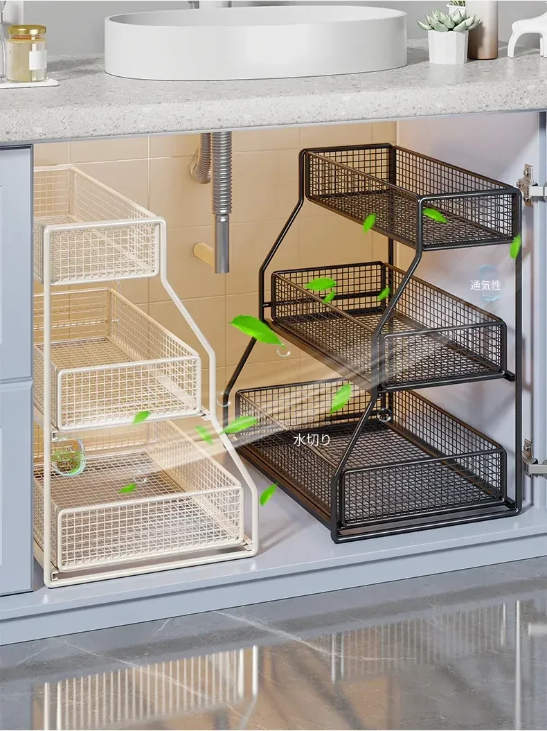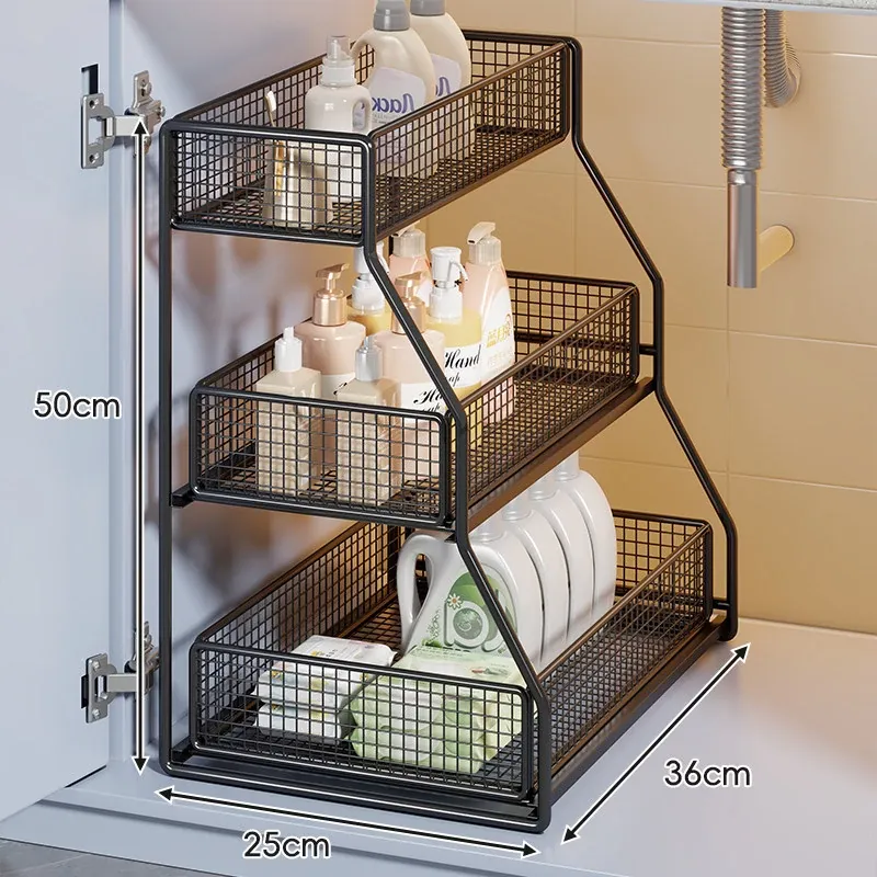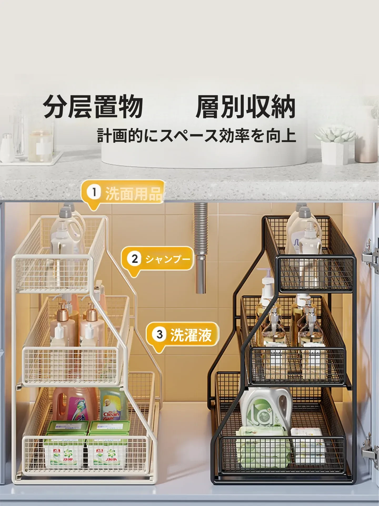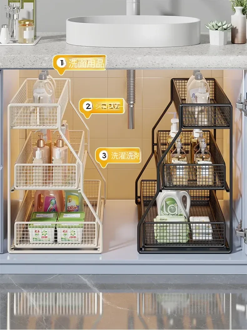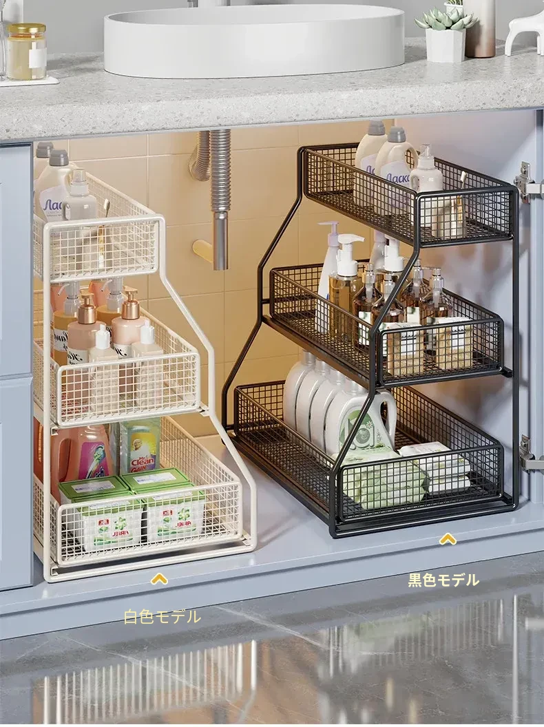 「下水槽収納ラック - 浴室や洗面台をすっきり整理!引き出し式の多層収納で、下 cabinet のスペースを有効活用。すべての必需品を手の届く場所に。」