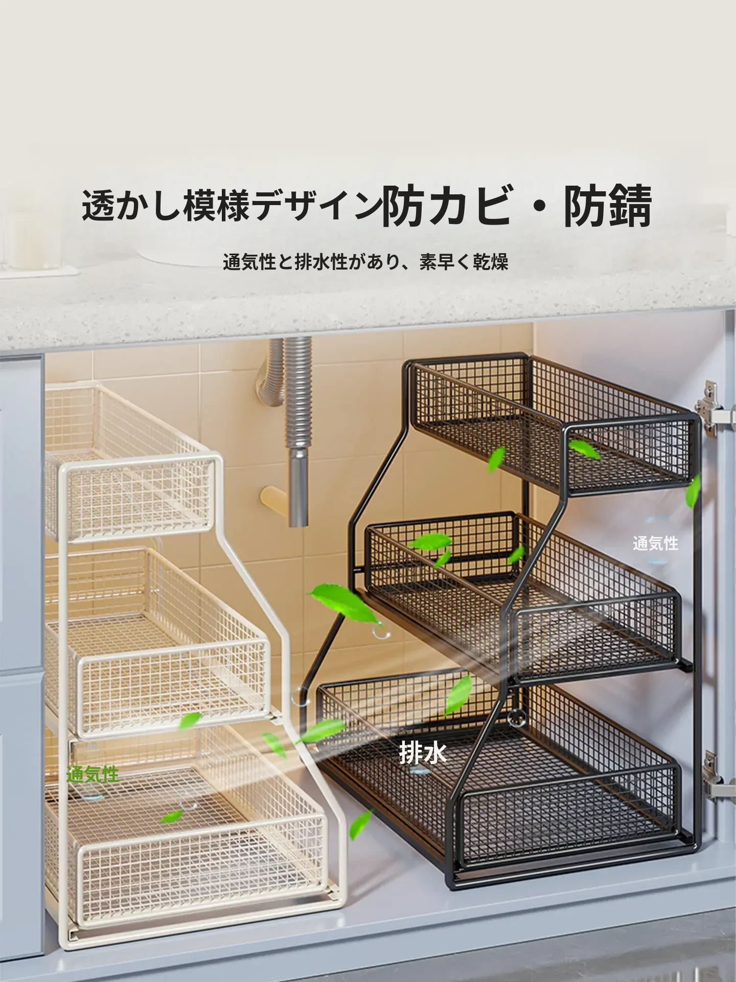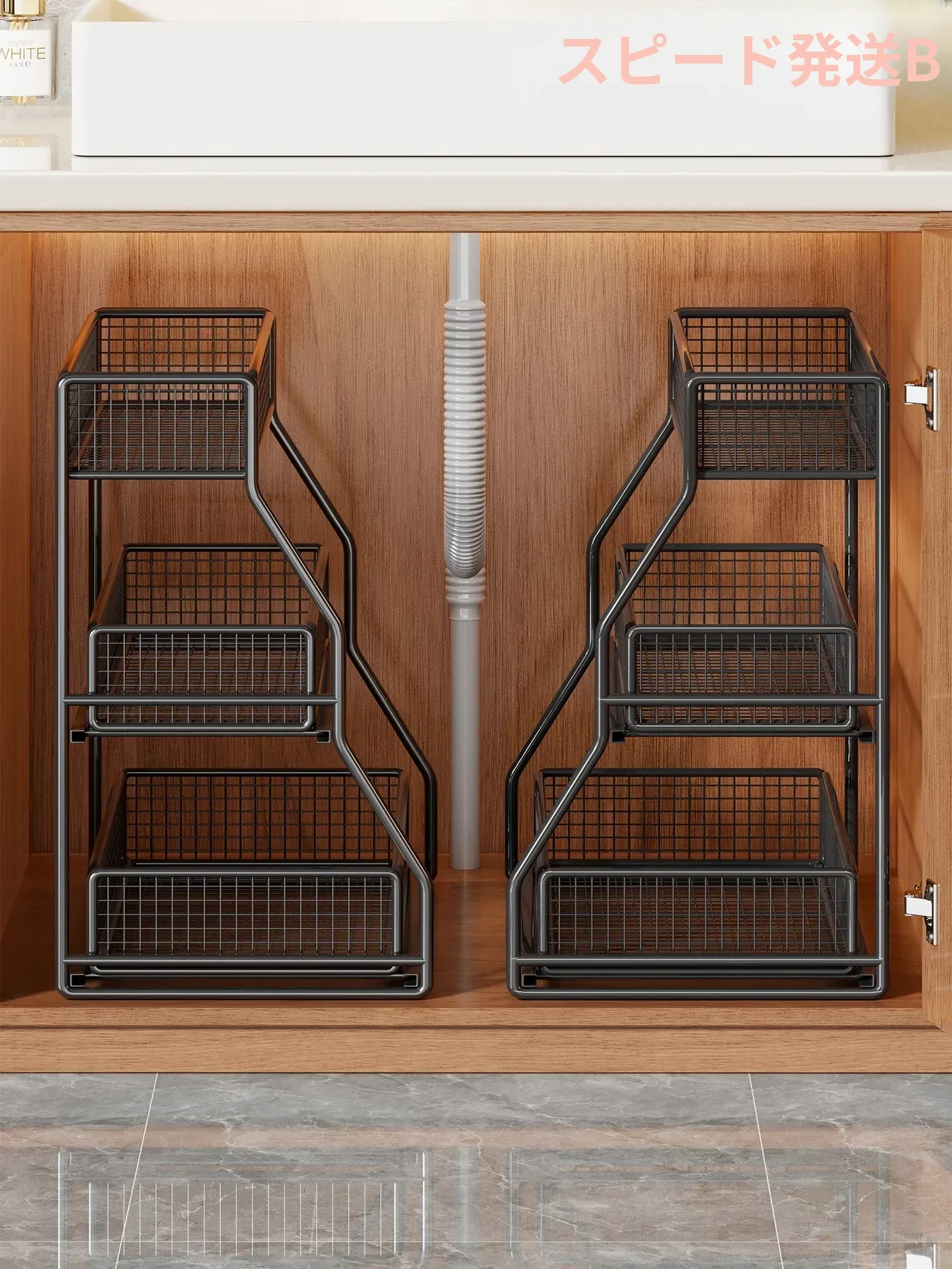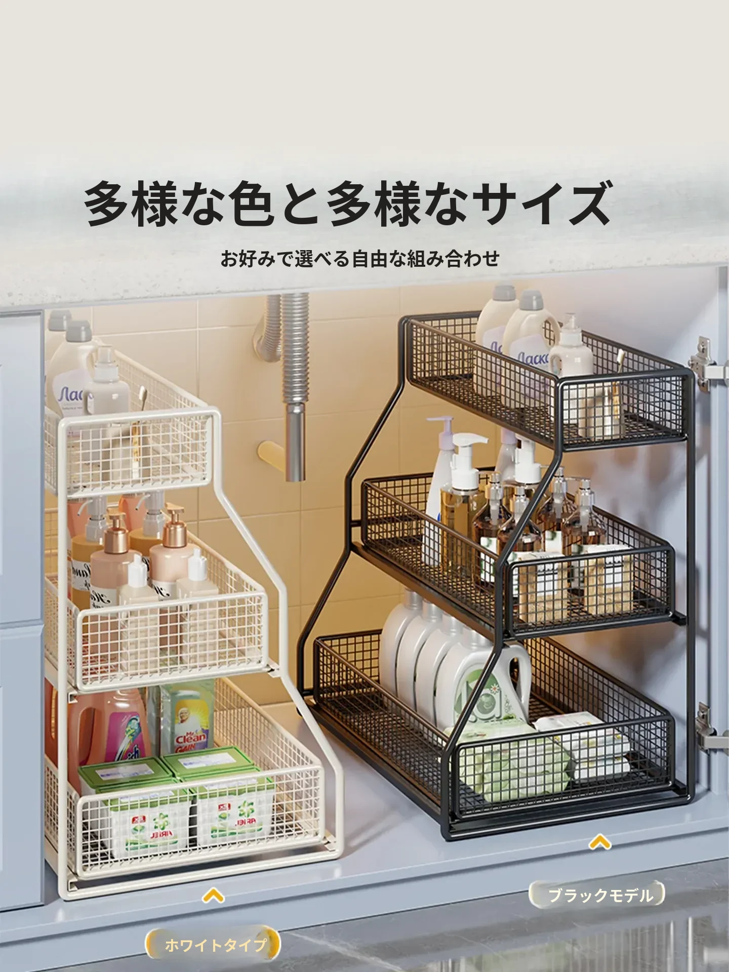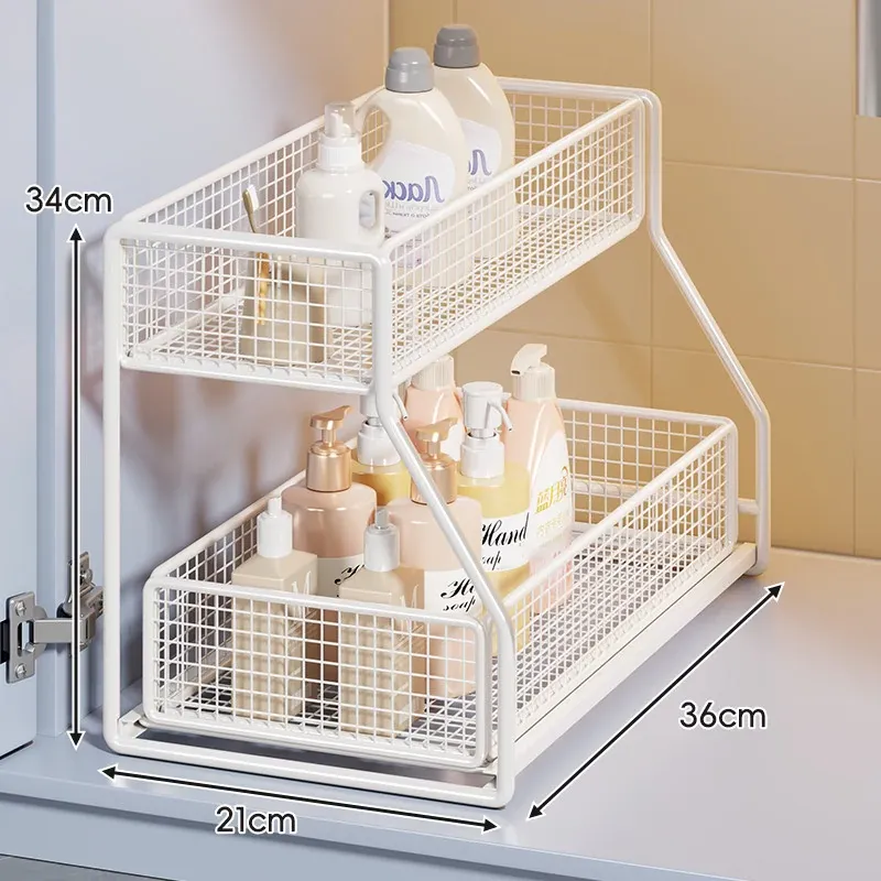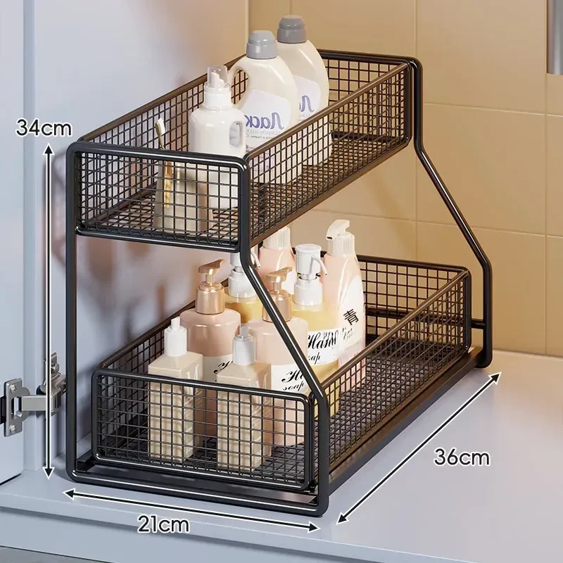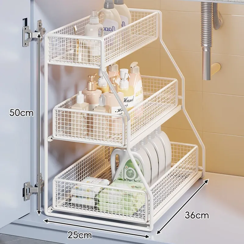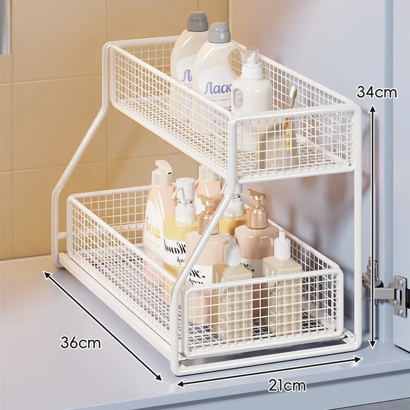 「下水槽収納ラック - 浴室や洗面台をすっきり整理!引き出し式の多層収納で、下 cabinet のスペースを有効活用。すべての必需品を手の届く場所に。」
