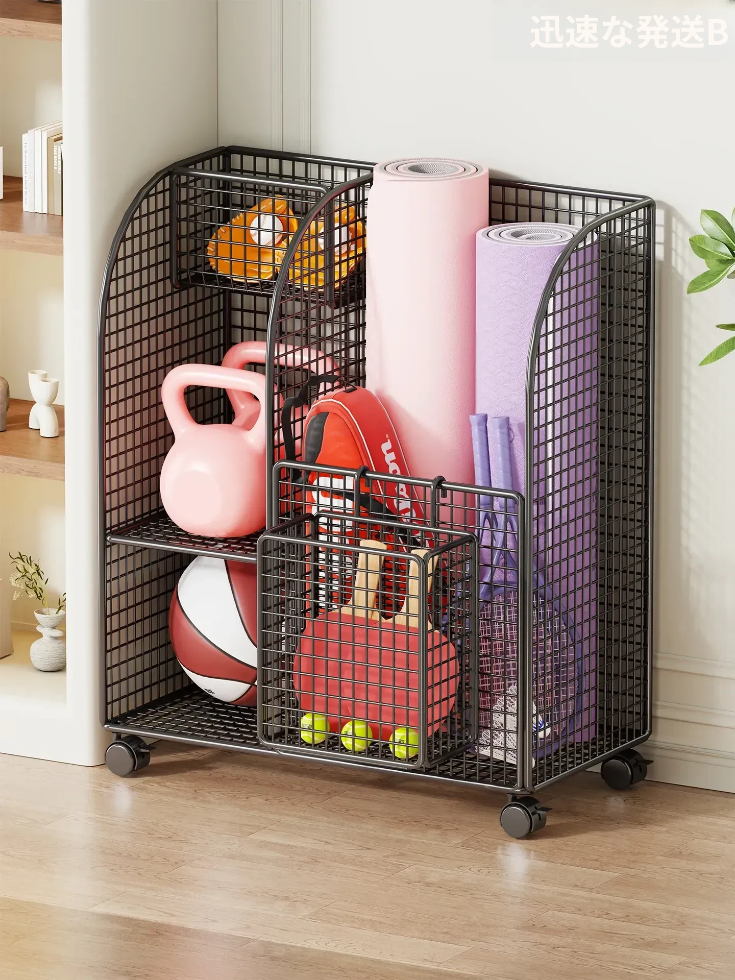 ヨガマット収納バスケット【キャスター付き・移動便利】バスケットボールやスポーツ用品の整理に最適!フィットネス器具の収納ラックで、あなたのトレーニングスペースをスッキリ整頓!