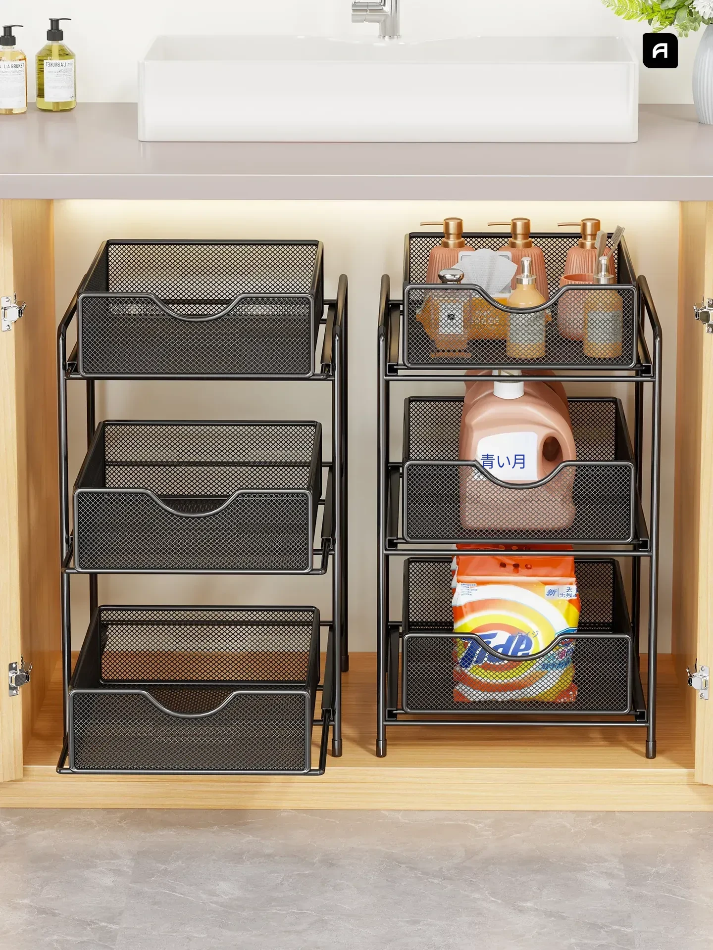 引き出し式収納ラック - 浴室やキッチンに最適!多層設計で洗面用具や調味料をスッキリ整理。下水槽下でも使える便利なアイテム!